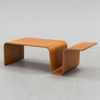 Föregående bild Nästa bild 11009938_fullsize soffbord med tidningställBORD 1900-talets andra hälft. Böjträ, fanerat med valnöt. Längd 123, bredd 45, höjd 36 cm.