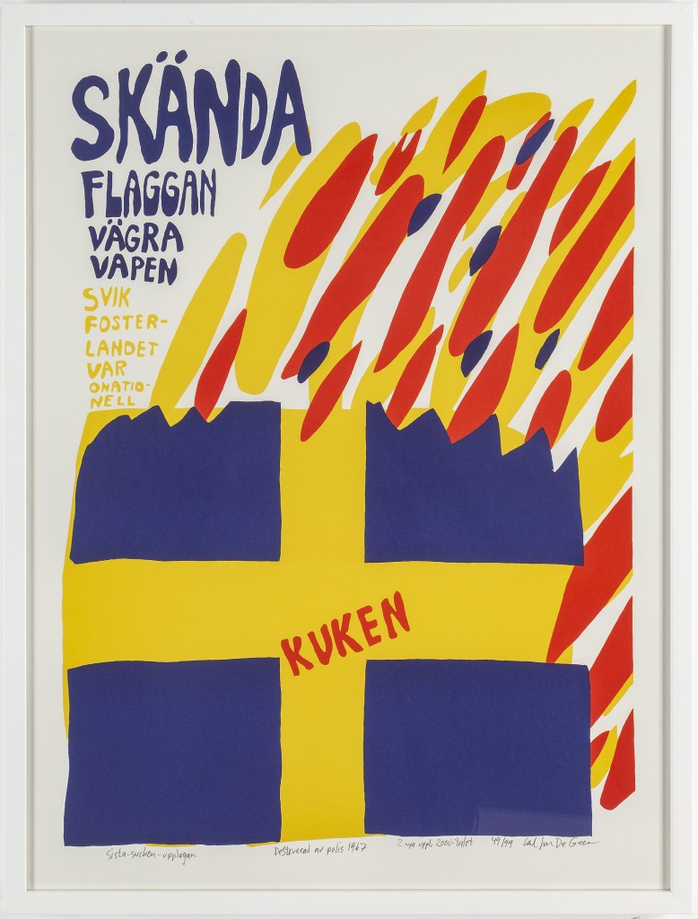 1967 ställde konstnären Carl Johan de Geer ut vapenvägraraffischer. Just det här motivet beslagtogs av polisen. Idag kult är den kult och ett samlarobjekt, tryckts upp som seriegrafier. Just denna hade ett utrop på 15 000 kr. Men de äldsta trycken från 1967 brukar klubbas för runt 60 000 kr.