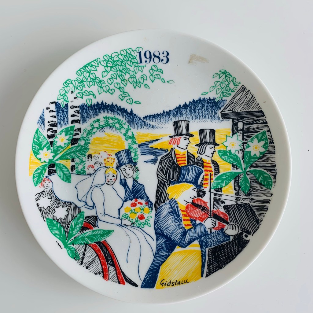 Frukosttallrikar är min nya retrokärlek. Kostar knappt något på auktioner och loppisar. Och väldigt roliga och personliga att ge bort. Dessutom en bit av det svenska folkhemmet där det var status med så kallade samlartallrikar. Denna ska min värmländska väninna få. Den heter ”Ack, Värmeland du sköna ”, motiv av konstnären Björn Gidstam. Femte tallriken i Svenska Röda Korsets samlarserie. På baksidan står det även att den är utgiven av Kronobergsdistriktets Röda Korset, finns i sammanlagt 7 500 ex. Detta är nr 761. Denna ska en av mina elektriska systrar från Kalmar få. Hon har efter att bott ute i världen och i Sthlm börjat tillbringa alltmer tid i Kalmar igen. Tallriken är tillverkad hos fina Upsala-Ekeby och utgiven av Svenska Reumatikerförbundet. Underbar blåvit tallrik i finaste benporslin från Gustavsberg. Utgiven av värdshuset Stallmästargården. Den ska min svärdotter få. Hon älskar blåvitt. Sammanlagt gick mina tre presenter på 75 kr! Prisvärt, personligt och återanvändning. Du kommer hitta massor av frukosttallrikar på auktioner och loppisar. Förbarma dig över de ratade statusobjekten. De är av bästa kvalite.