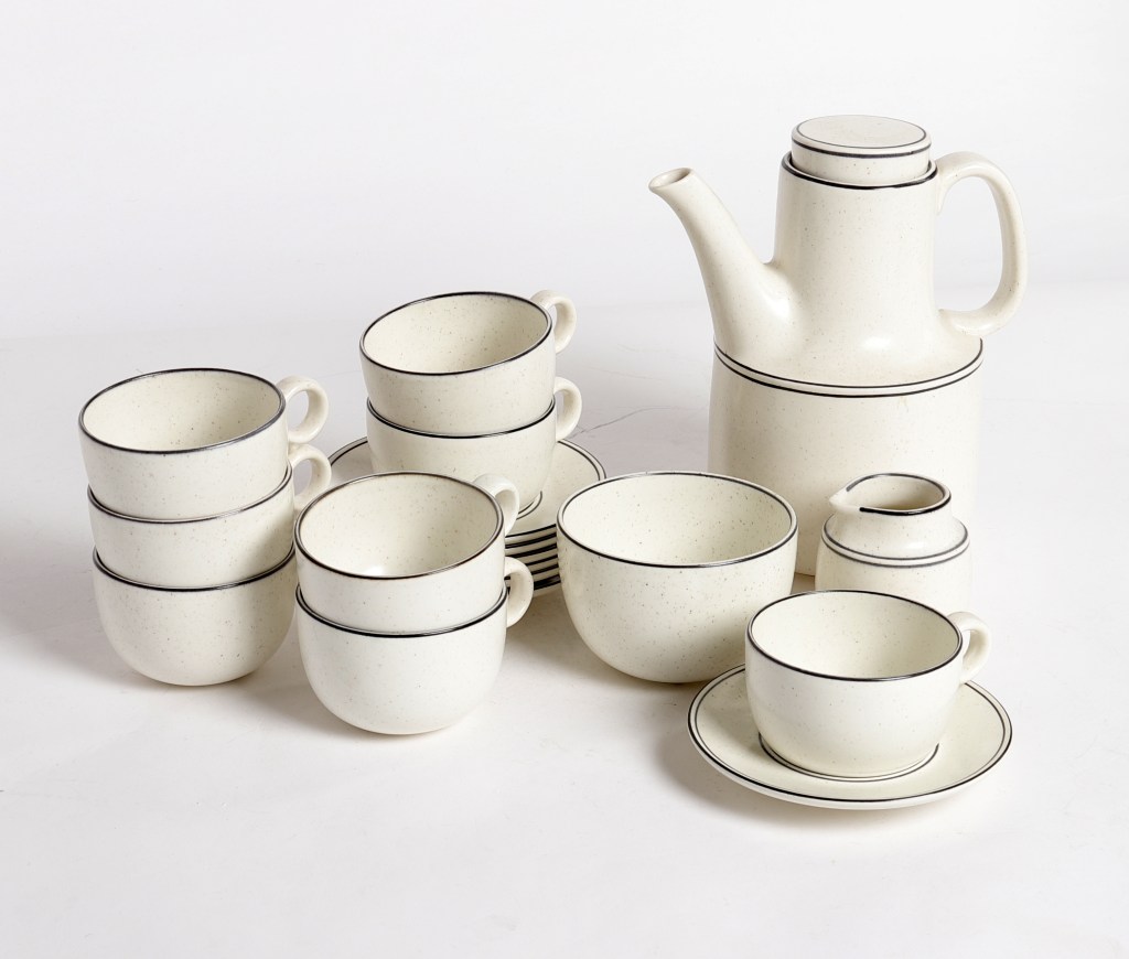 Glad servis av Timo Sarvimäki som var hos Rörstrands mellan 1973 och 1975. Denna kaffeservis, 15 delar, hade ett utrop på 2 500 kr men gick för 5 088 kr i maj hos Thelin & Johansson.