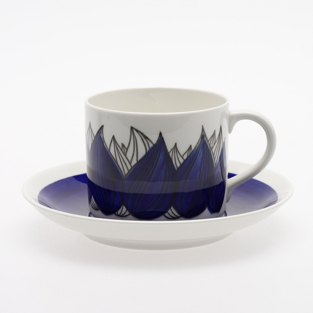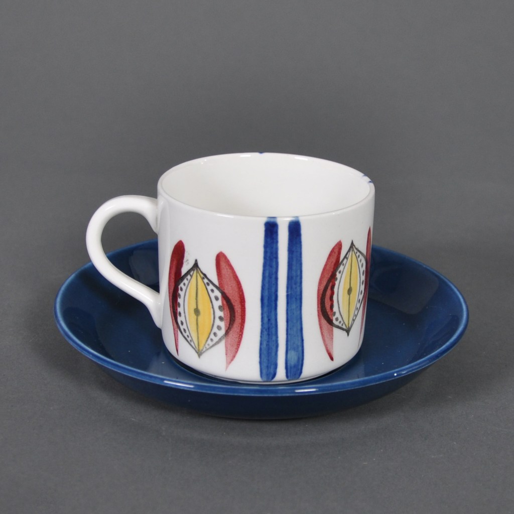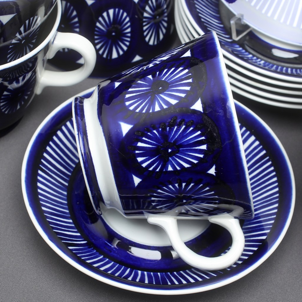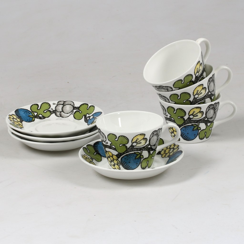 Tekoppar av Ulla Procopé (1921-1968) för Arabia. Hon handmålade sitt mönster direkt på kopparna. Hon dog blott 47 år gammal i stendammslunga, på grund av hälsan hade hon fått sluta dreja själv. Hon fick aldrig uppleva hur framgångsrika hennes serviser blev. Sju koppar med fat hade ett utrop på 2 500 kr men såldes för 6 450 kr i mars hos auktionshuset Kolonn.