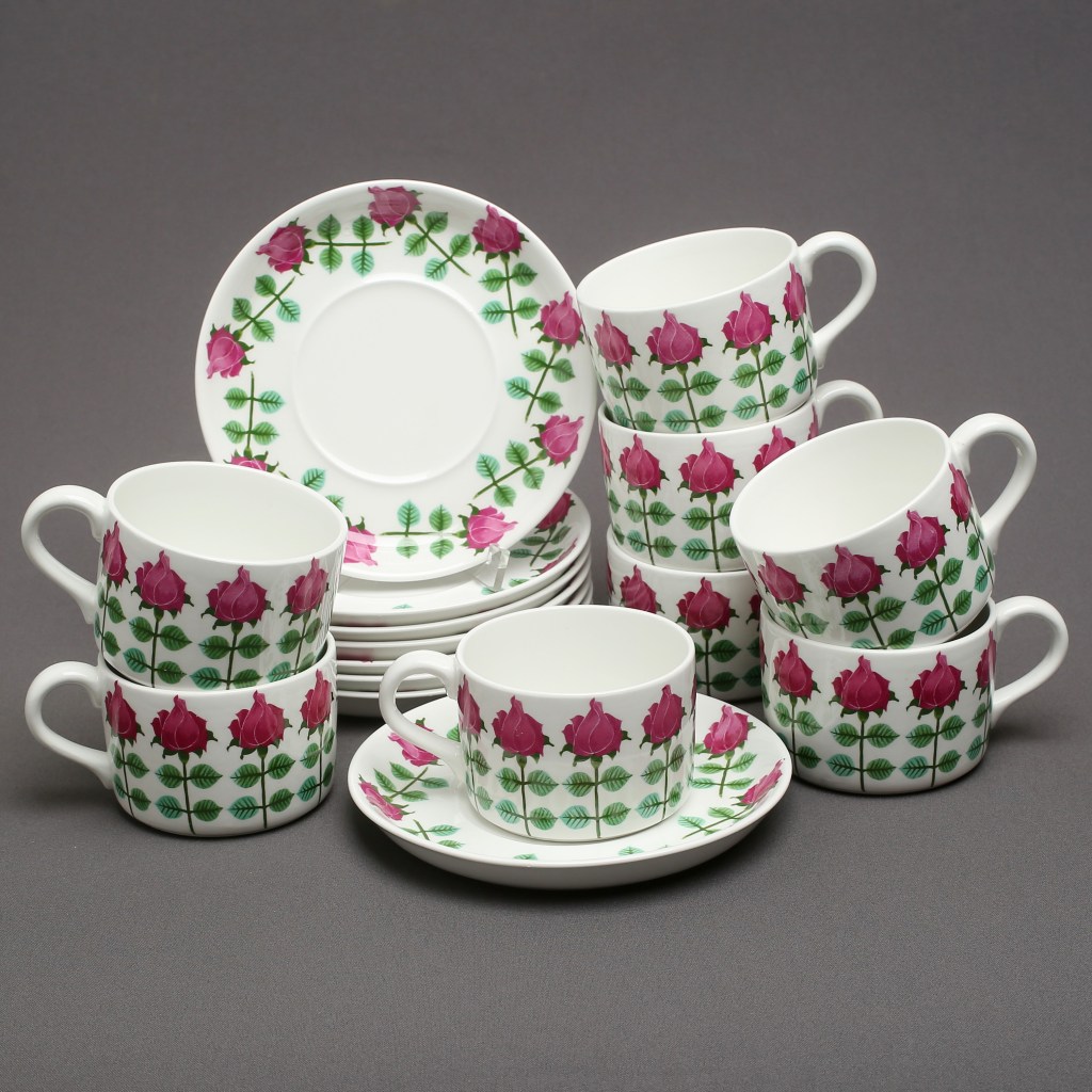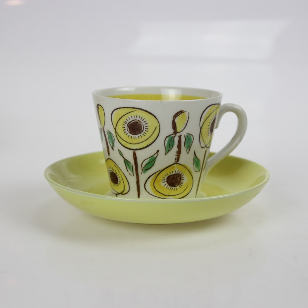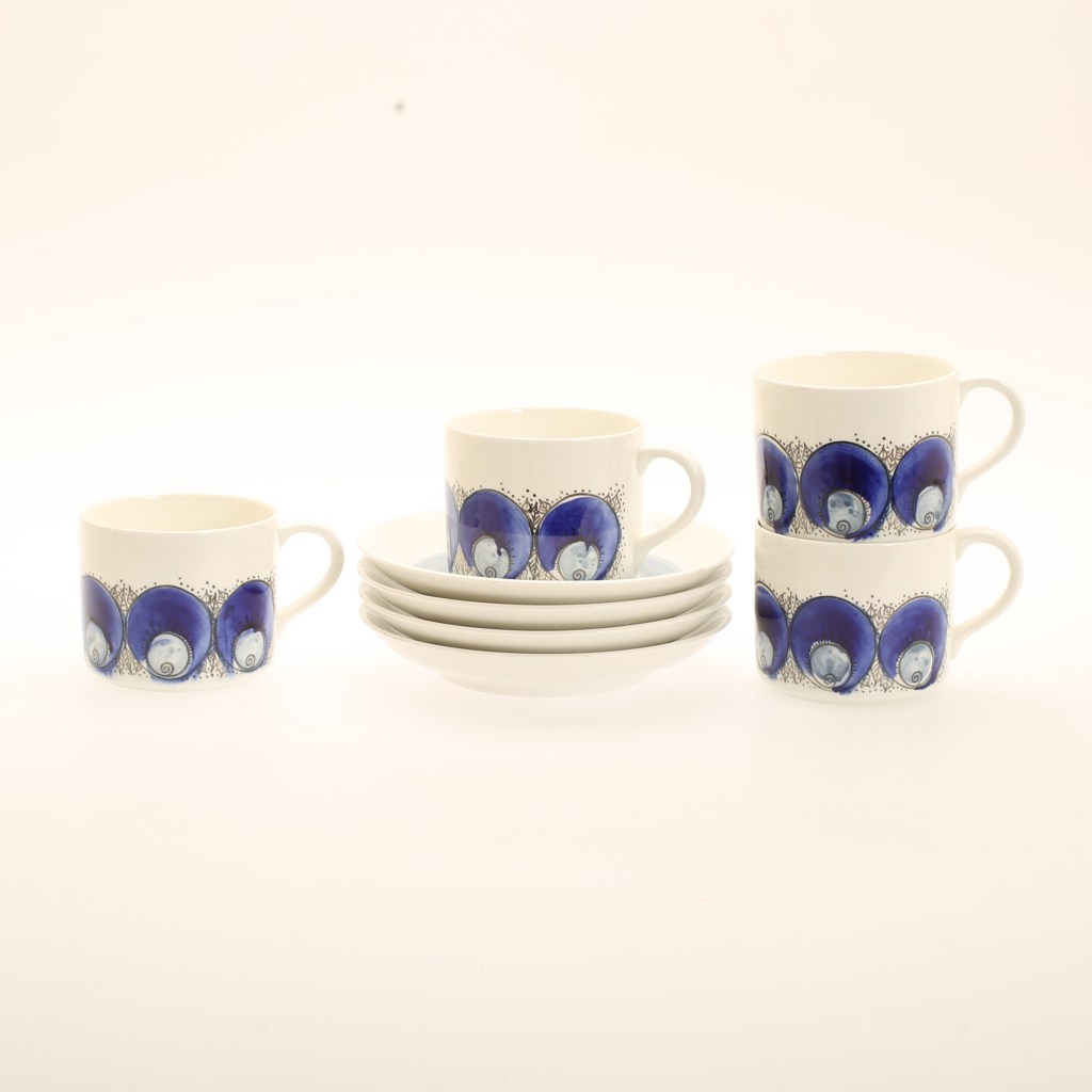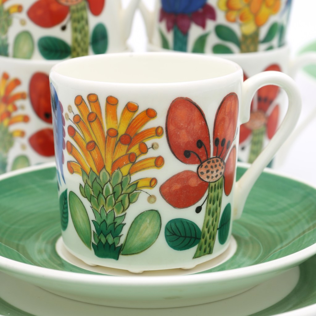 Tekoppar av Ulla Procopé (1921-1968) för Arabia. Hon handmålade sitt mönster direkt på kopparna. Hon dog blott 47 år gammal i stendammslunga, på grund av hälsan hade hon fått sluta dreja själv. Hon fick aldrig uppleva hur framgångsrika hennes serviser blev. Sju koppar med fat hade ett utrop på 2 500 kr men såldes för 6 450 kr i mars hos auktionshuset Kolonn.