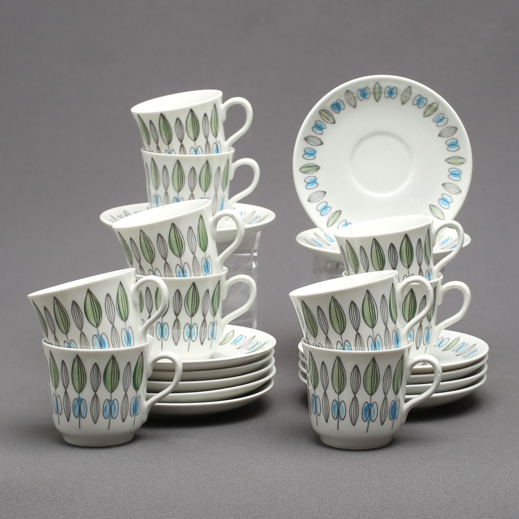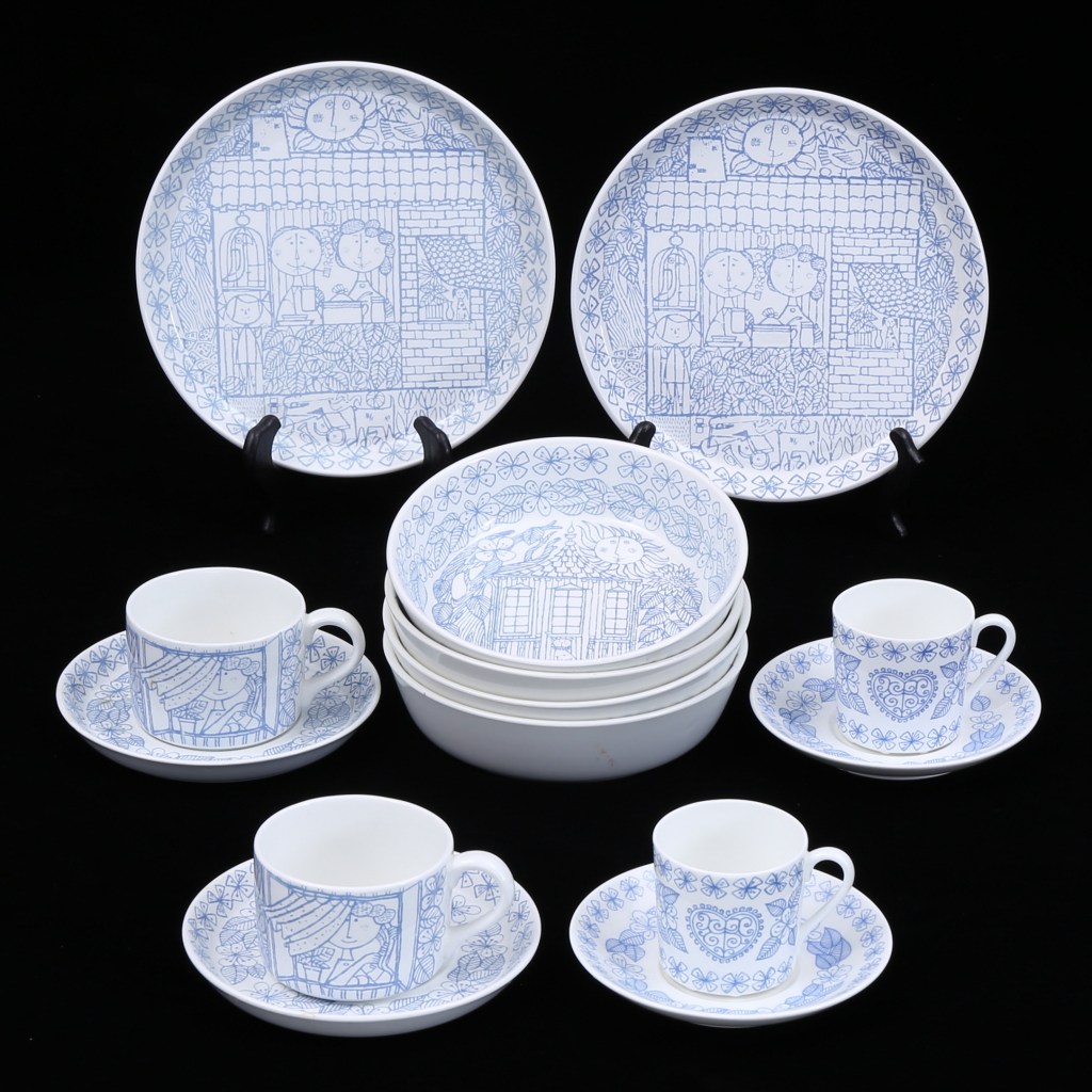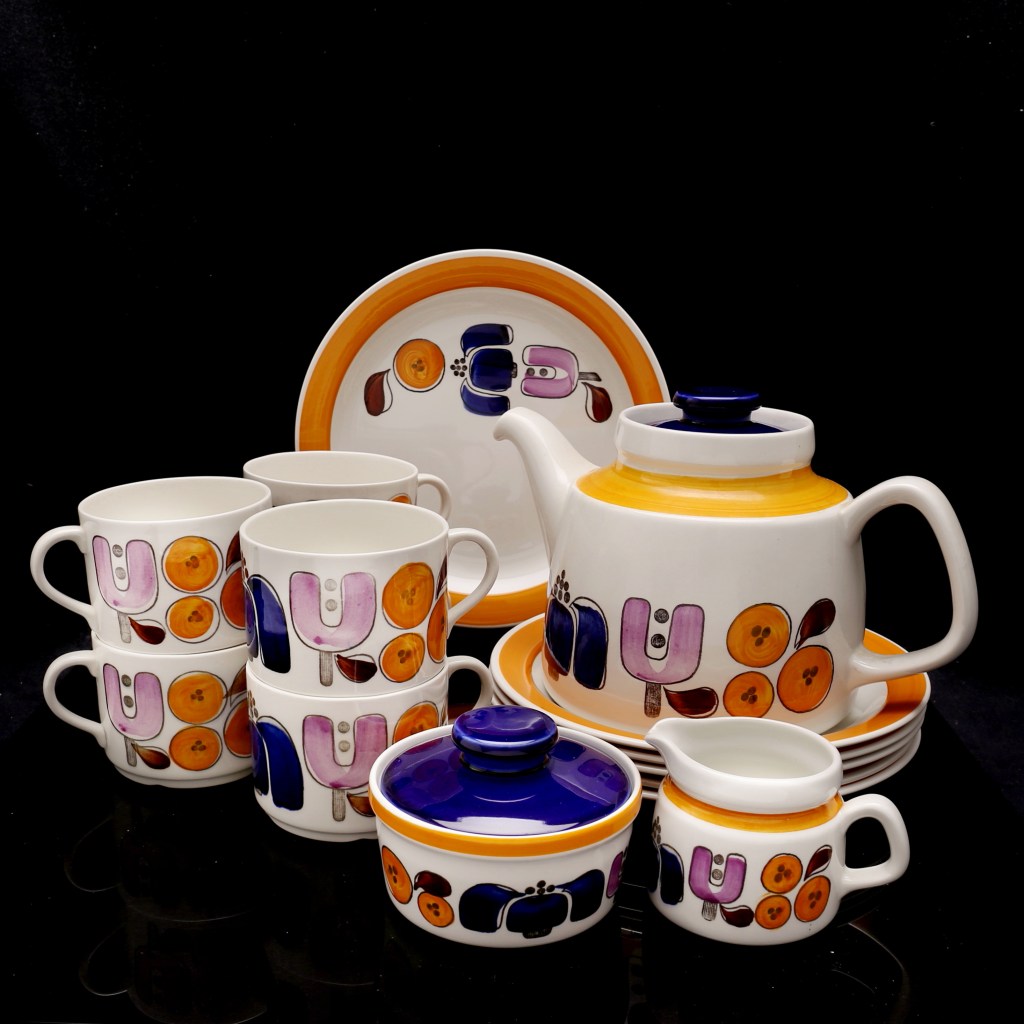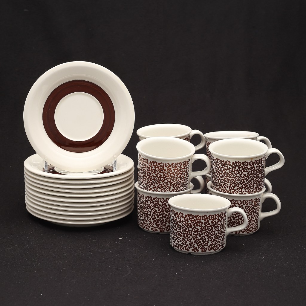 Formgiven av Inkeri Leivo för Arabia, i produktion mellan 1975 och 1979. Sex koppar med fat, sex assietter och en gräddkanna hade ett utrop på 800 kr hos Thelin & Johansson, klubbades för 3 420 kr i november.