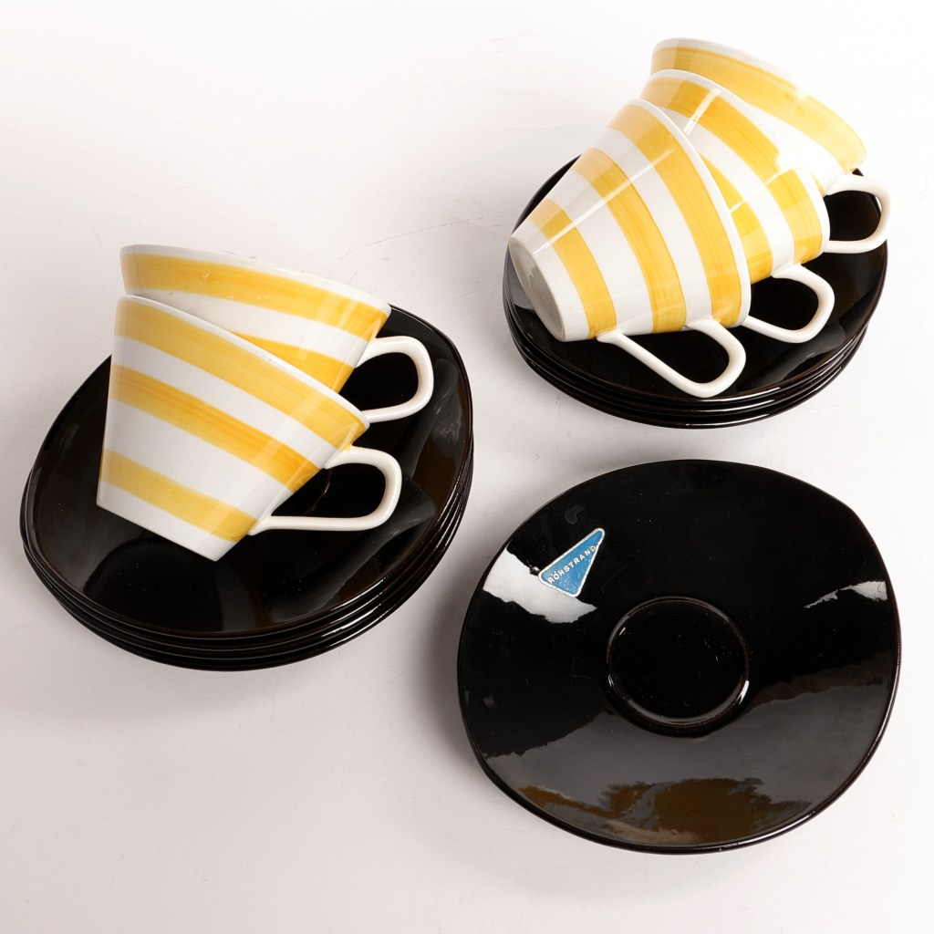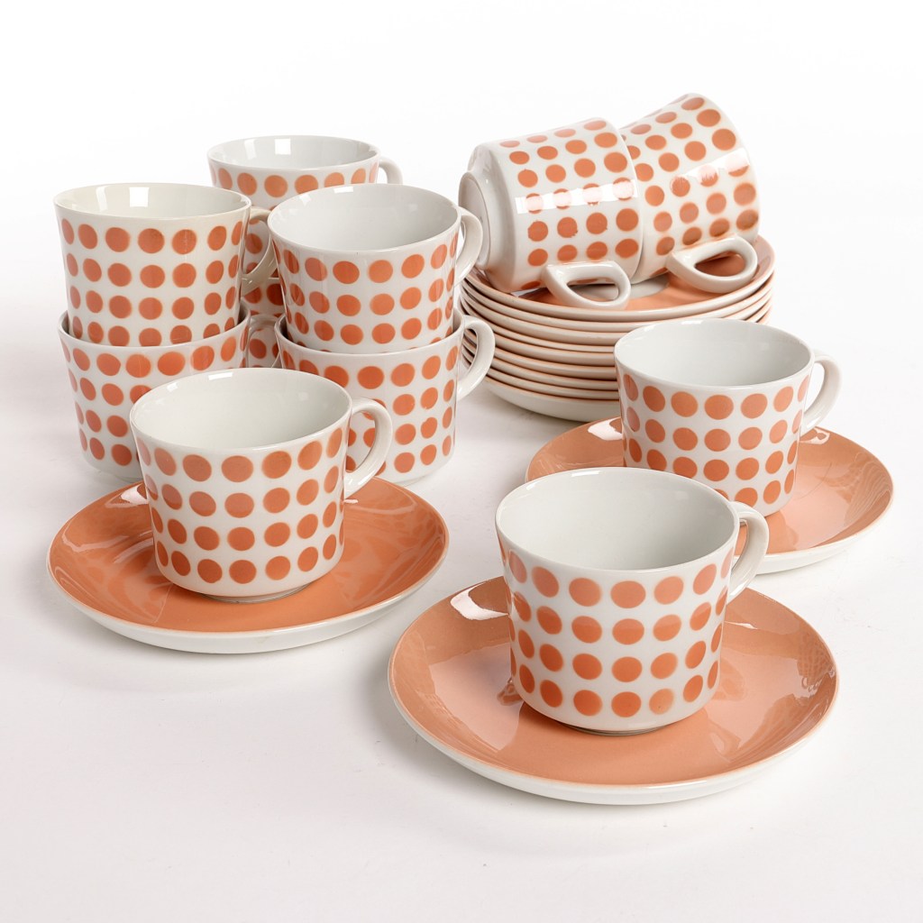 Kaffeservis av Peter Winqvist för Arabia, 1970-tal. Tolv kaffefat och nio koppar, utrop 1 500 kr, klubbade för 3 399 kr hos Växjö auktionskammare i maj.
