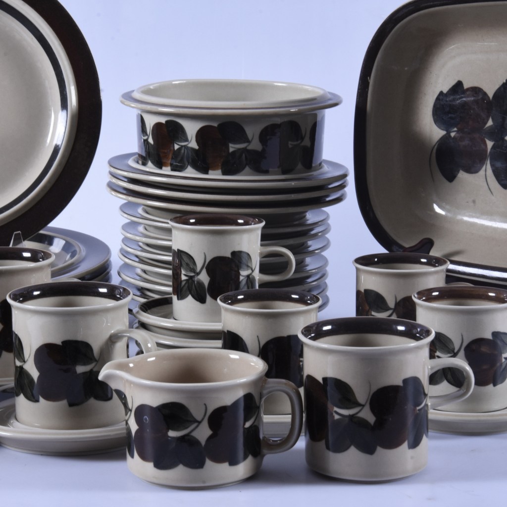 En handmålad servis i mörkt bruna och gröna toner av Ulla Procopé (1921-1968) för finska Arabia. 40 delar hade ett utrop på 600 kr i november, men gick för 8 800 kr hos Halmstads auktionskammare.