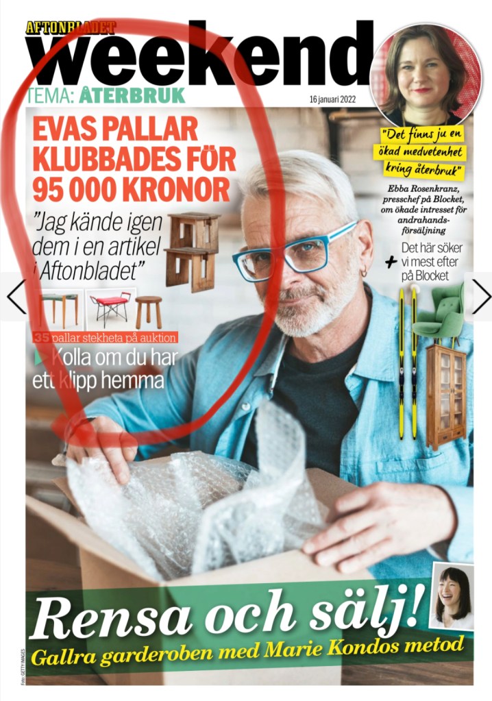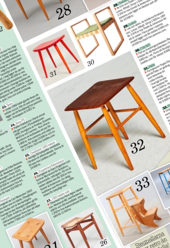 För ett år sedan läste Eva min artikel i Aftonbladet om att pallar ökar i pris på auktioner. Hon tyckte hon kände igen ett par och gick ut på balkongen. Där stod vad hon trodde var ett par helt värdelösa pallar. De var slitna och nötta, du ser dem på bilden här ovan. Men det skulle visa sig att de var mycket eftertraktade. I maj låg de ute till försäljning för 35 000 kronor på Bukowskis Modern Art & Design slagauktion. De klubbades för 95 000 kronor. Jag började kolla pallar igen – under 2021 har de ökat än mer. Idag har jag en artikel med 35 pallar i Aftonbladet – flera av dem känner du säkert igen. Kolla om du har en dyrgrip…