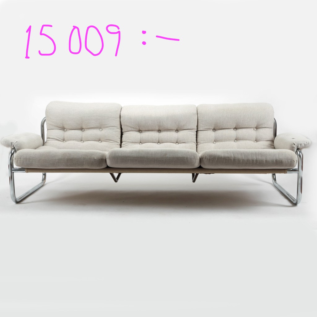 8.Borkum. Tresitssoffa av John Bertil Häggström. Finns i 1979 års katalog, pris 1 284 kr. Textil och stålrör. Utrop 3 500 kr hos Stockholm auktionsverk Malmö i mars, såld för 15 009 kr.