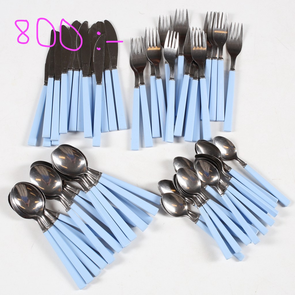 18.Fiesta. Bestick från mitten av 1980-talet. År 1987 fick du 16 delar Fiesta för 69 kr hos Ikea. Fanns i grönt, rött, vitt, rosa, ljusblått och gult. Nu har de plötsligt blivit heta på auktioner. 24 delar vita gick för 570 kr på Tradera i mars, 11 rosa såldes för 520 kr. Och ett gäng ljusblåa hade ett utrop på 800 kr hos Gästriklands auktionskammare för ett år sedan.