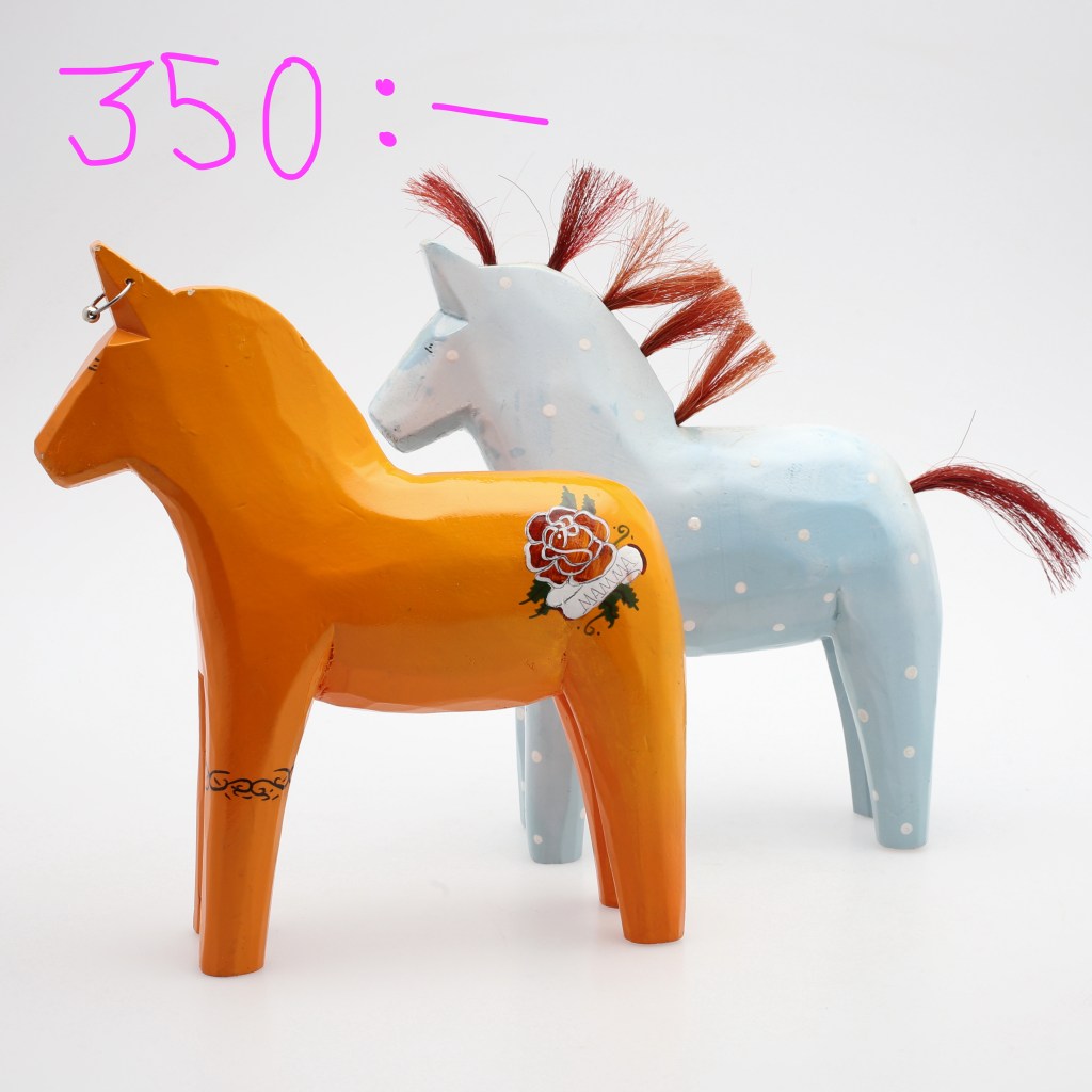 14.Stolle. Stolle en rolig nytolkning av dalahästen. Prydde omslaget på katalogen 2002. Stolle fyller 20 i år! Formgiven av Katarina Brieditis. Kostade 129 kr/styck. Klubbas för mellan 149 och 350 kr på Tradera.