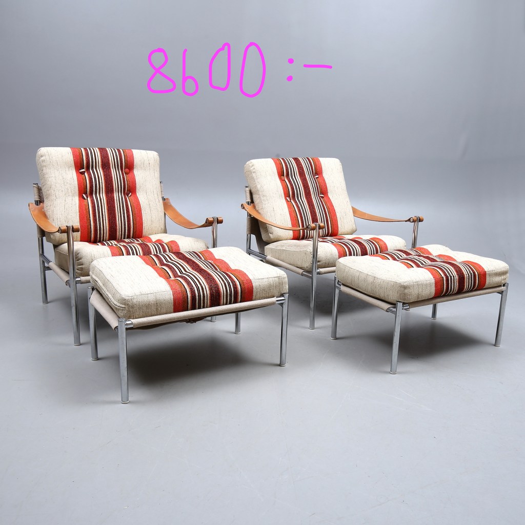 15.Rigg. Ett par fåtöljer med fotpall av Gillis Lundgren, 1960/70-tal. Utrop 5 000 kr, sålda för 8 600 kr hos Auktionshuset Kolonn för ett år sedan.