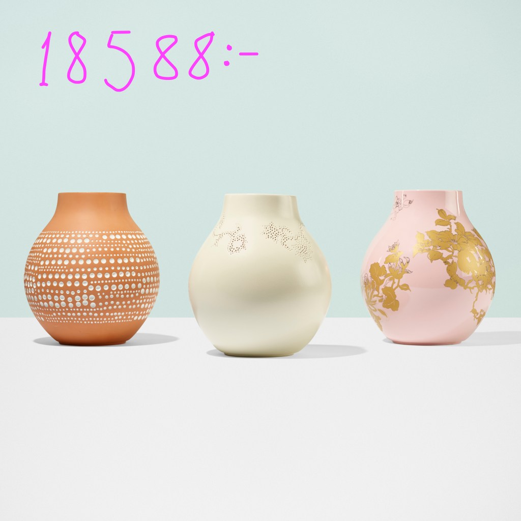 4. Ikea PS vaser . År 2005 anlitade Ikea den världsberömda designikonen Hella Jongerius från Nederländerna. Så i PS kollektionen 2005/2006 kom hennes fyra vaser som stod för olika världsdelar. De kostade runt 300 kr/styck. Fram till nu har de knappt sålts på andrahandsmarknaden. För fyra år sedan såldes dessa tre vaser på en auktion i USA för 2 000 dollar, värdet i svenska kronor var då 18 588 kr. Så från att ha betalat 1 200 kr för fyra stycken år 2005 är det en ordentlig värdeutveckling fram till idag. Det blev startskottet för att den kommer ut även hos svenska auktionshus, Tradera och Blocket.