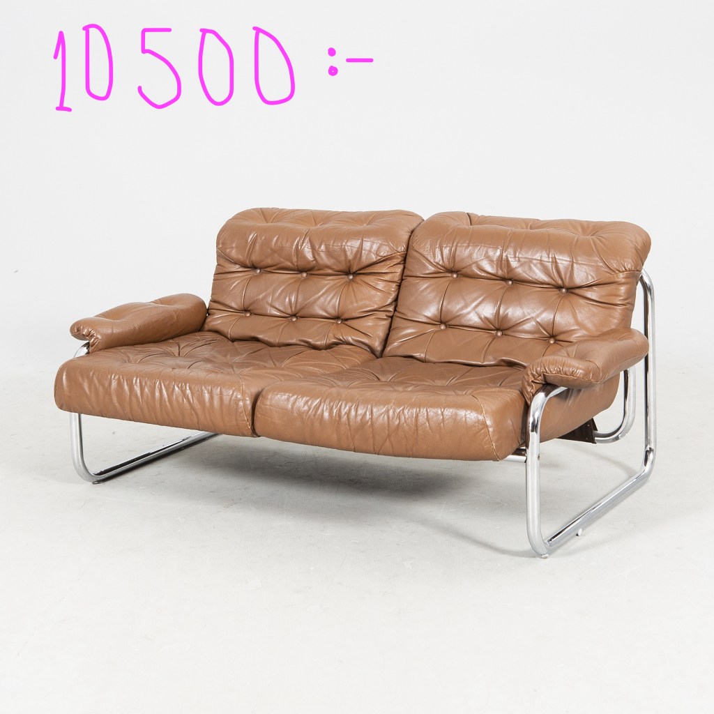 19.Soffan Borkum. Tvåsitssoffa i skinn av John Bertil Häggström. Fanns med i katalogen 1979 och kostade då 1 616 kr, nyligen klubbades den hos bukowskis.online för 10 500 kr.