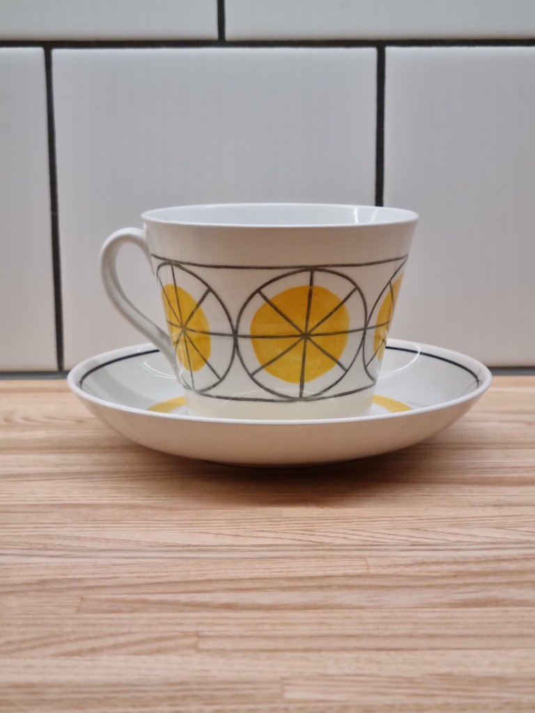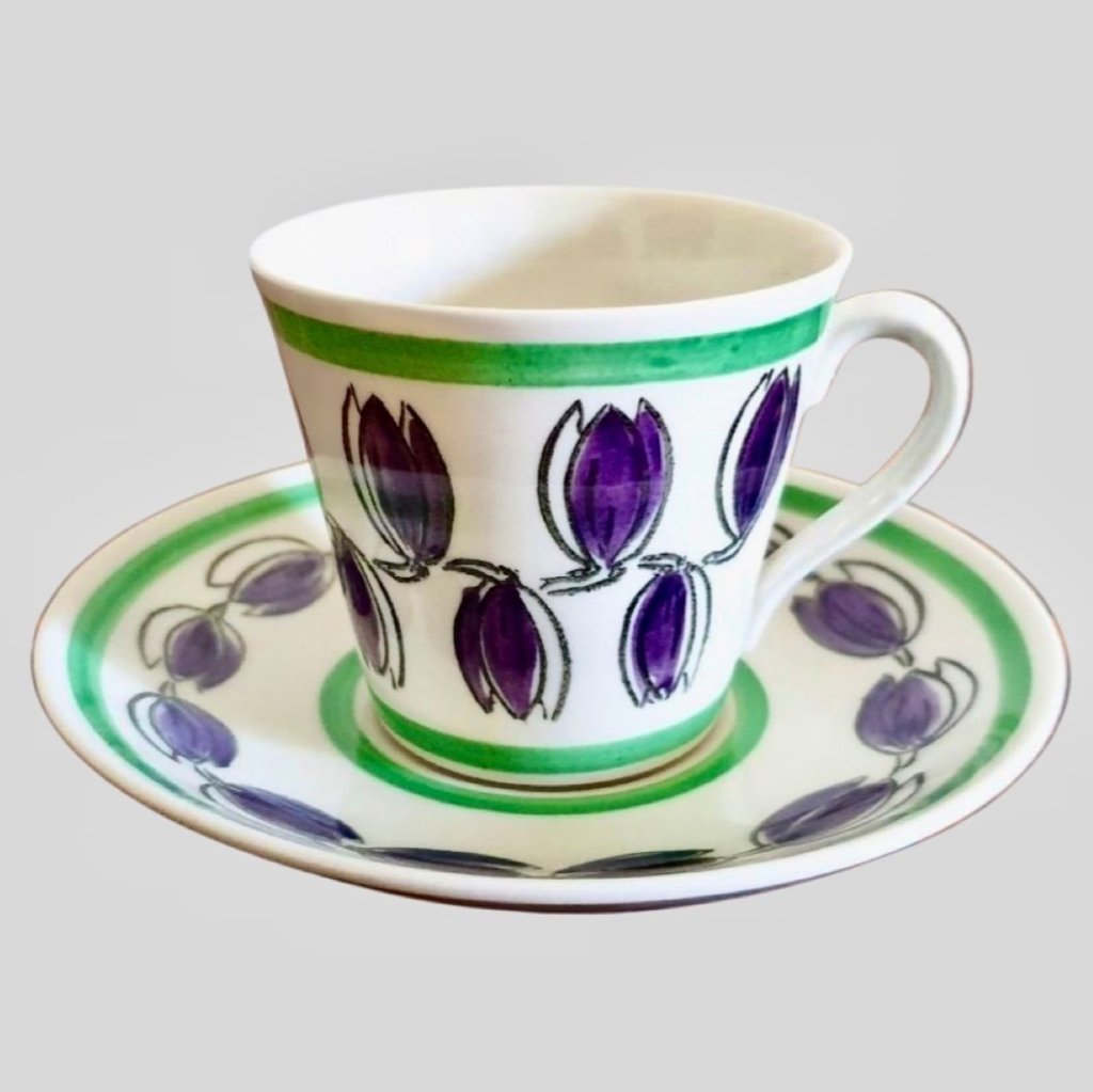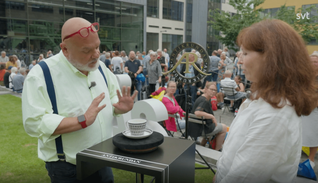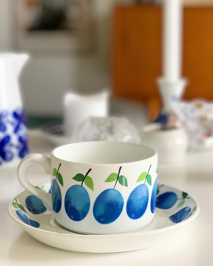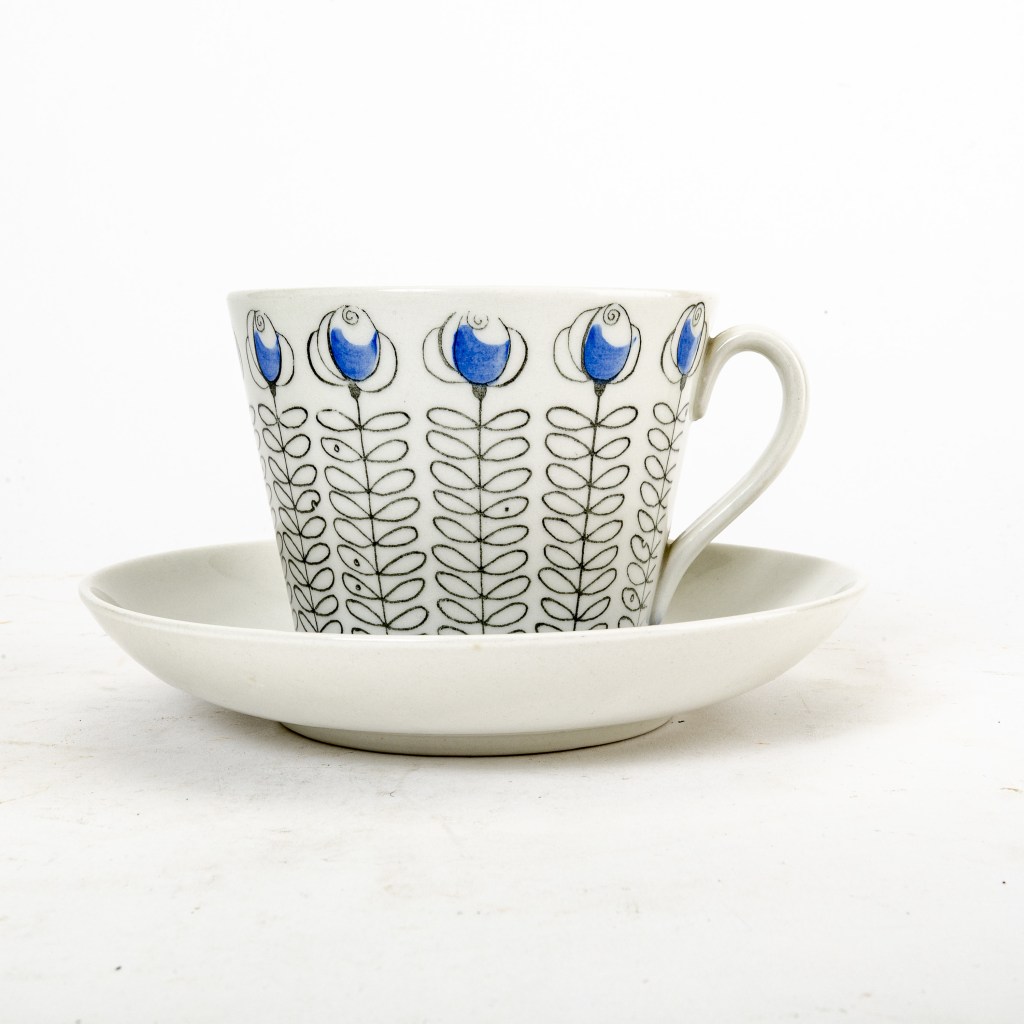 11. Prunus. En Stig Lindberg kopp för Gustavsberg med ett välkänt mönster. Kom i början av 1960-talet. Men här en chokladkopp, de var ännu större än tekopparna, och är idag extra eftertraktade. Gäller alla serviser. Utrop en krona, såld för 4 049 kr hos Tradera.
