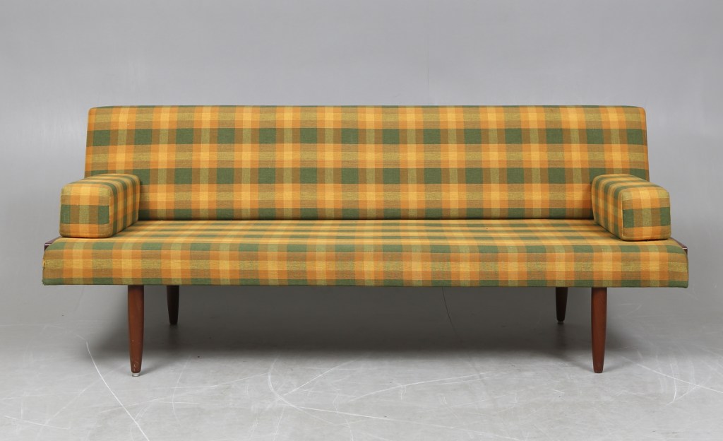 1. Dagbädd. Från Holms fabriker AB, 1960-tal. Utrop 1 500 kr, såld för 1 501 kr hos Gomér & Andersson. Holms tillverkade många soffor, bland annat åt Ikea.