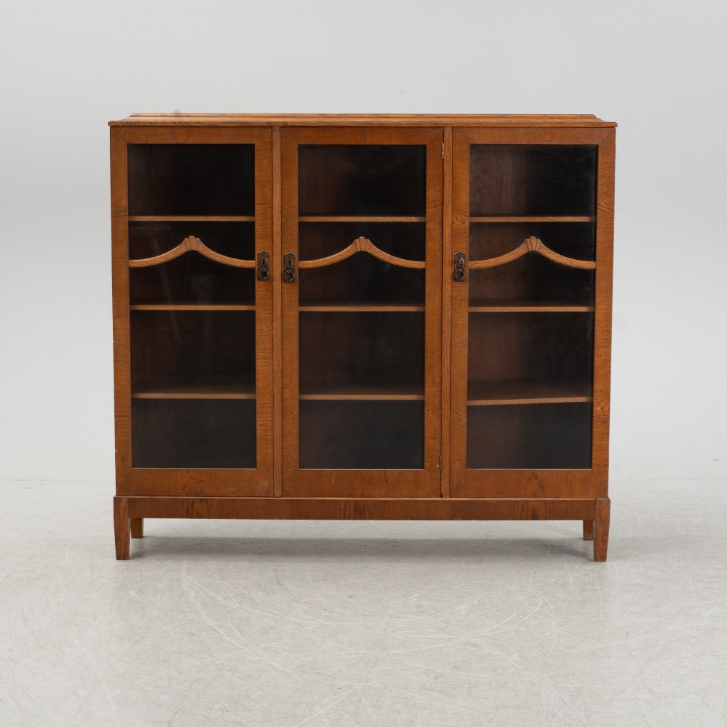 6. Bokskåp. Från Aktiebolaget Ekmöbler, Virserum, 1930-tal. Ek. Tre glasade dörrar framför hyllinredning. Utrop 4 000 kr hos Bukowskis, sålt för 2 400 kr.
