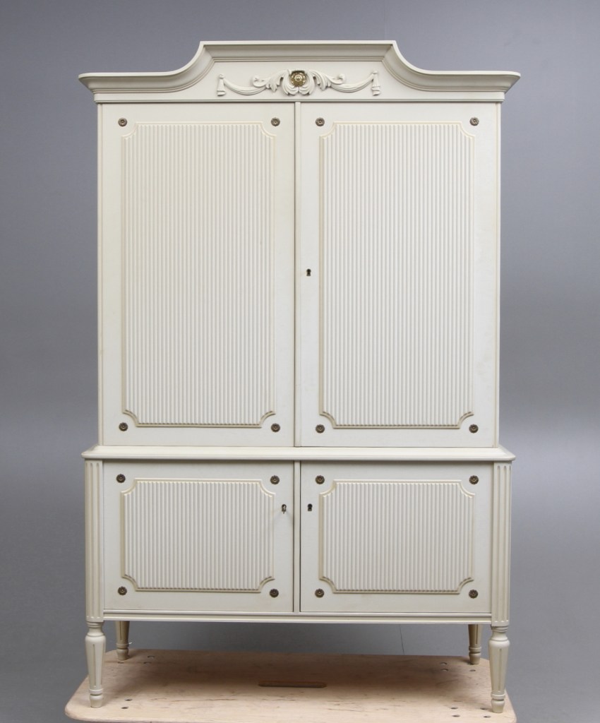 4. Matsalsskåp. Möbler nystilar tillverkades ofta i Virserum. Här är dock ett skåp i gustaviansk stil från Oscar Ekelunds Snickerifabrik, 1900-tal. Utrop 1 200 kr hos Gomér & Andersson, sålt för 2 550 kr.