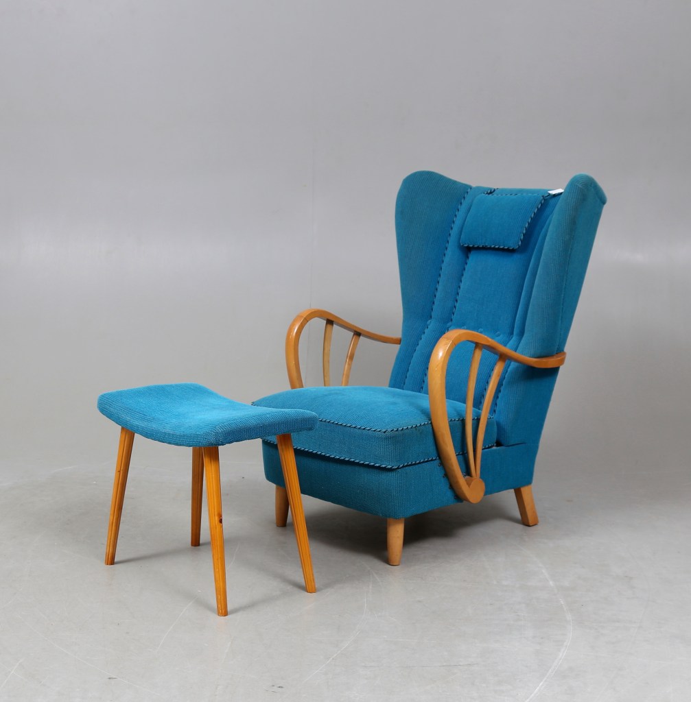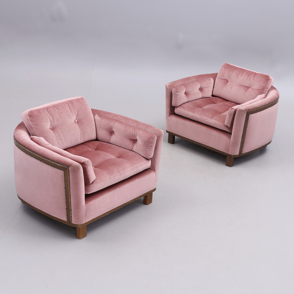5. Fåtöljer. Art Deco stil, Holms fabriker, 1960/70-tal. Utrop 3 000 kr, sålda för 9 600 kr hos Växjö auktionskammare. Holms fabriker startades 1918 av soldaten Karl Holm, 1944 tog sönerna över. 1973 såldes Holms och 1978 gick det i konkurs. När det gick som bäst på 1960-talet hade man över 100 anställda.