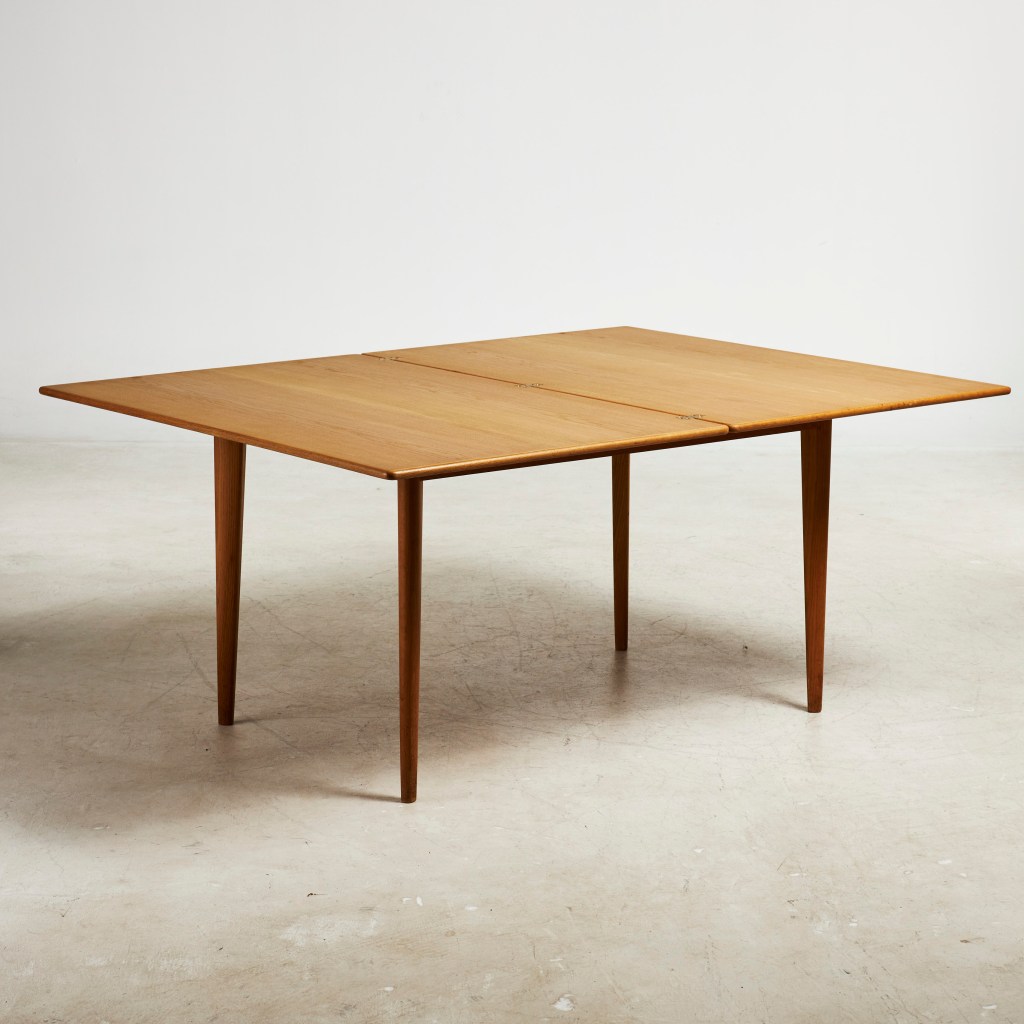 2. Matbord. Ett mycket snyggt och stilrent matbord av formgivaren Evald Melander. Bord nr 248 med utfällbar skiva och ekben stämpelmärkt ”Wirserums Nya Möbelfabrik Hultarp”. Utrop 2 000 kr, sålt för 5 600 kr hos Stockholms auktionsverk Globen i höstas. Har verkligen potential!