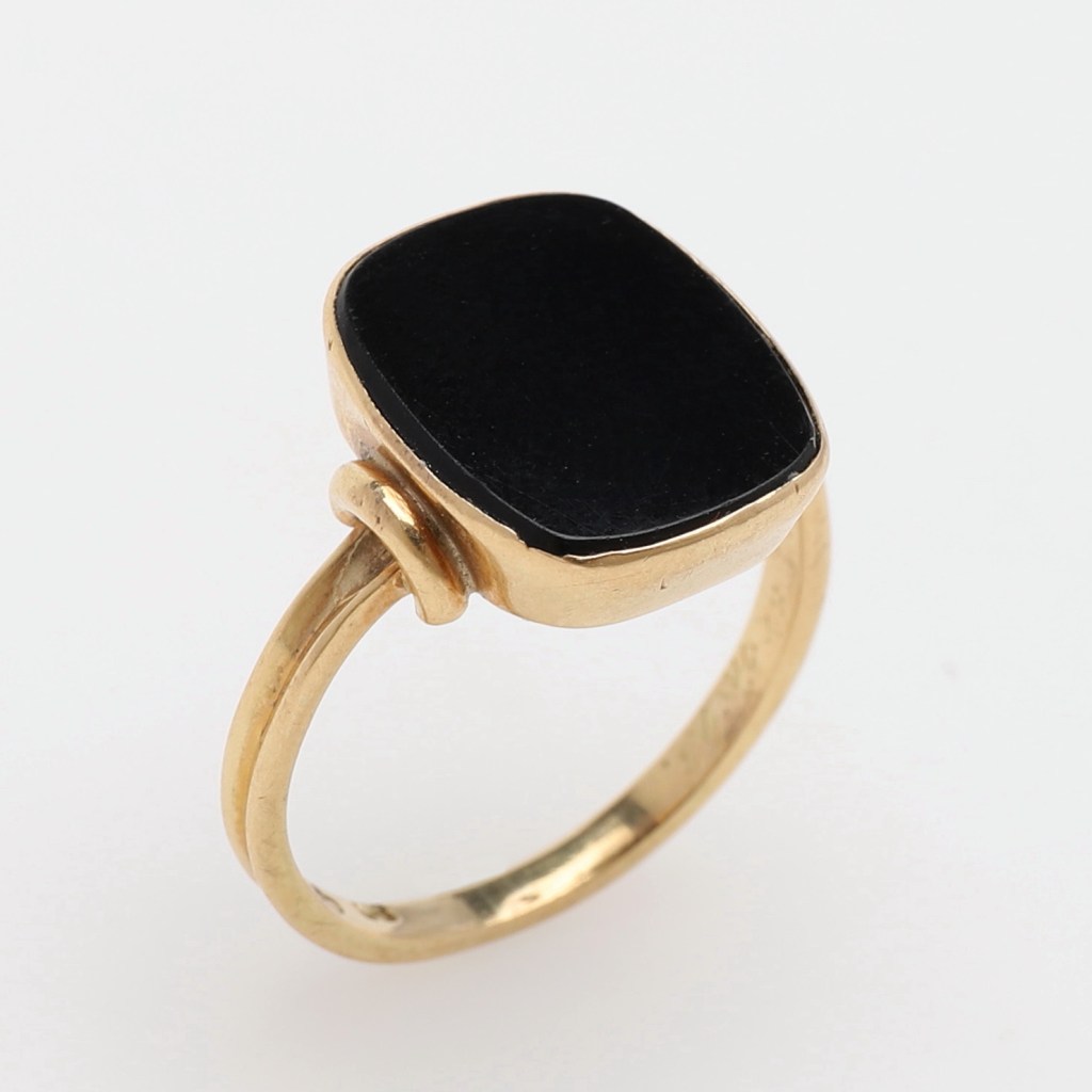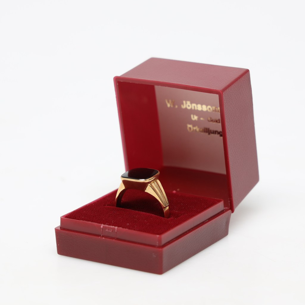 Klackring. Med infattad svart onyx. Vikt 3,4 gram. I ask från W Jönsson Örkelljunga. Utrop 1 500 kronor, klubbad för 1 809 kronor hos Stockholm auktionsverk Helsingborg.
