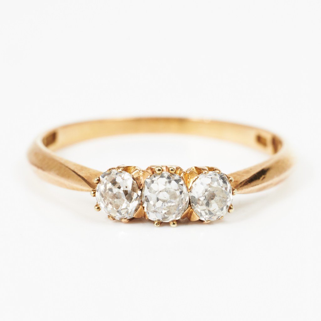 Trestensring. Ringar från anrika guldsmeder går för högre priser. Här en trestensring i guld med tre gammalslipade diamanter, från C.F. Carlman, Stockholm 1919. Utrop 4 000 kronor, såld för 7 011 kronor Stockholms auktionsverk Magasin 5 i december.