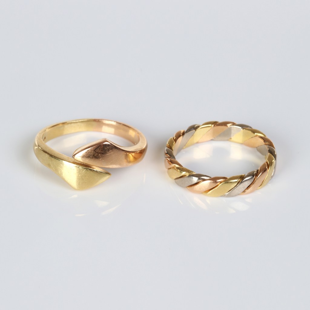 Flerfärgade ringar. Två ringar i flerfärgat guld, 18K guld. En stämplad Gustav Dahlgren & Co, Malmö 1982 och en med italienska kontrollstämplar. Vikt 10,9 gram. Utrop 4 600 kronor, sålda för 6 000 kronor hos Skånes auktionsverk i januari.