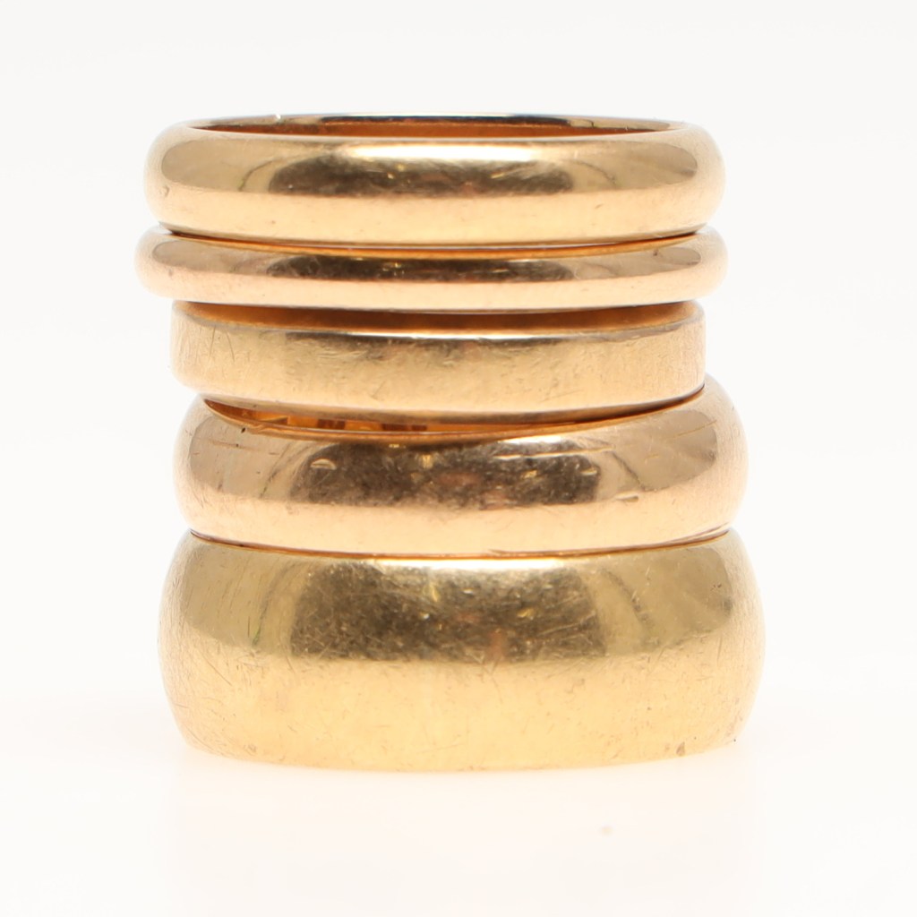 Släta guldringar. Fem släta guldringar, gravyrer invändigt, bruksslitage. Sammanlagd vikt 26,2 gram. Utrop 14 000 kronor, sålda för 11 000 kronor hos Stockholm auktionsverk Helsingborg i somras.