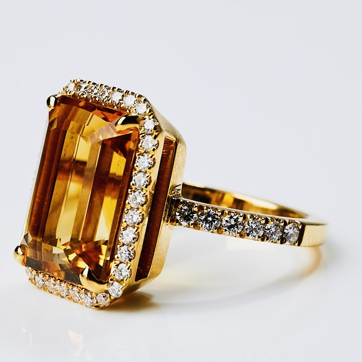 7. Ring i 18 k guld, med en citrin 8,02 ct samt 42 st små diamanter totalt ca 0,58 ct. Utrop 18 000 kronor, bevakningspris uppnåddes ej. Stockholm auktionsverk Globen.