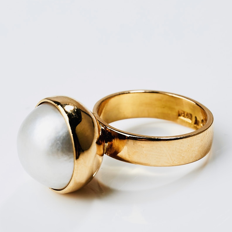 9. Cocktailring, 18 k guld, med pärla, Linde Aktiebolag G, Borlänge, 1963. Utrop 12 500 kronor, bevakningspris uppnåddes ej. Hos Stockholm auktionsverk Globen.
