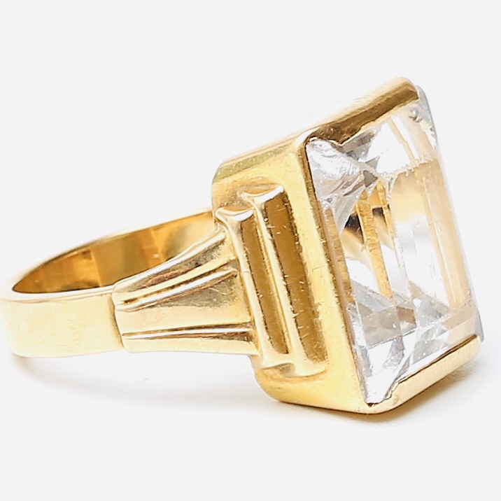 12. Här en i 18K guld och med en infattad bergkristall, stämplad Malmö 1971, vikt 3,6 gram. Utrop 2 000 kronor hos Stockholm auktionsverk Helsingborg, klubbad för 1 600 kronor.