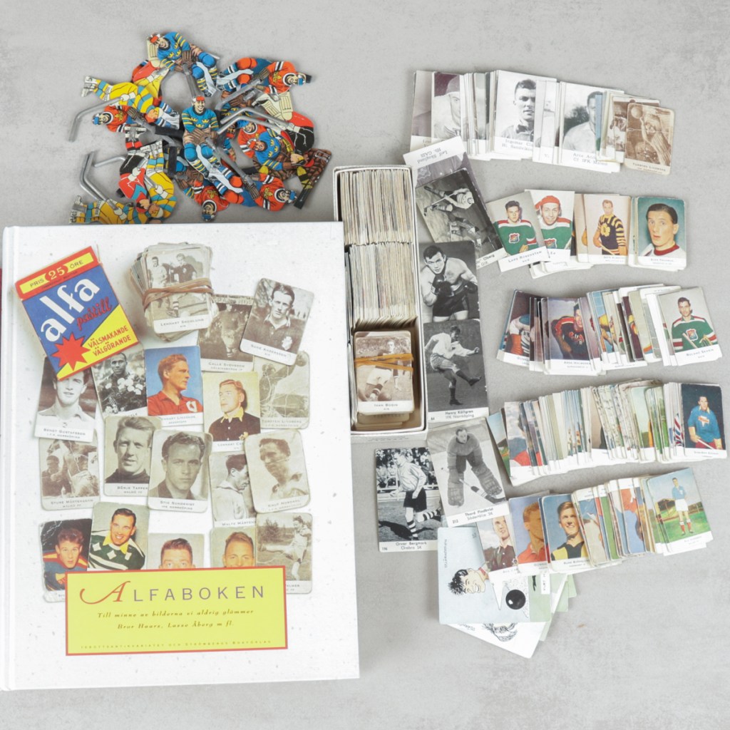Samlarbilder + hockeyspelare i metall. Utrop 400 kronor, klubbat för 2 900 kronor hos Södersens auktionshus.