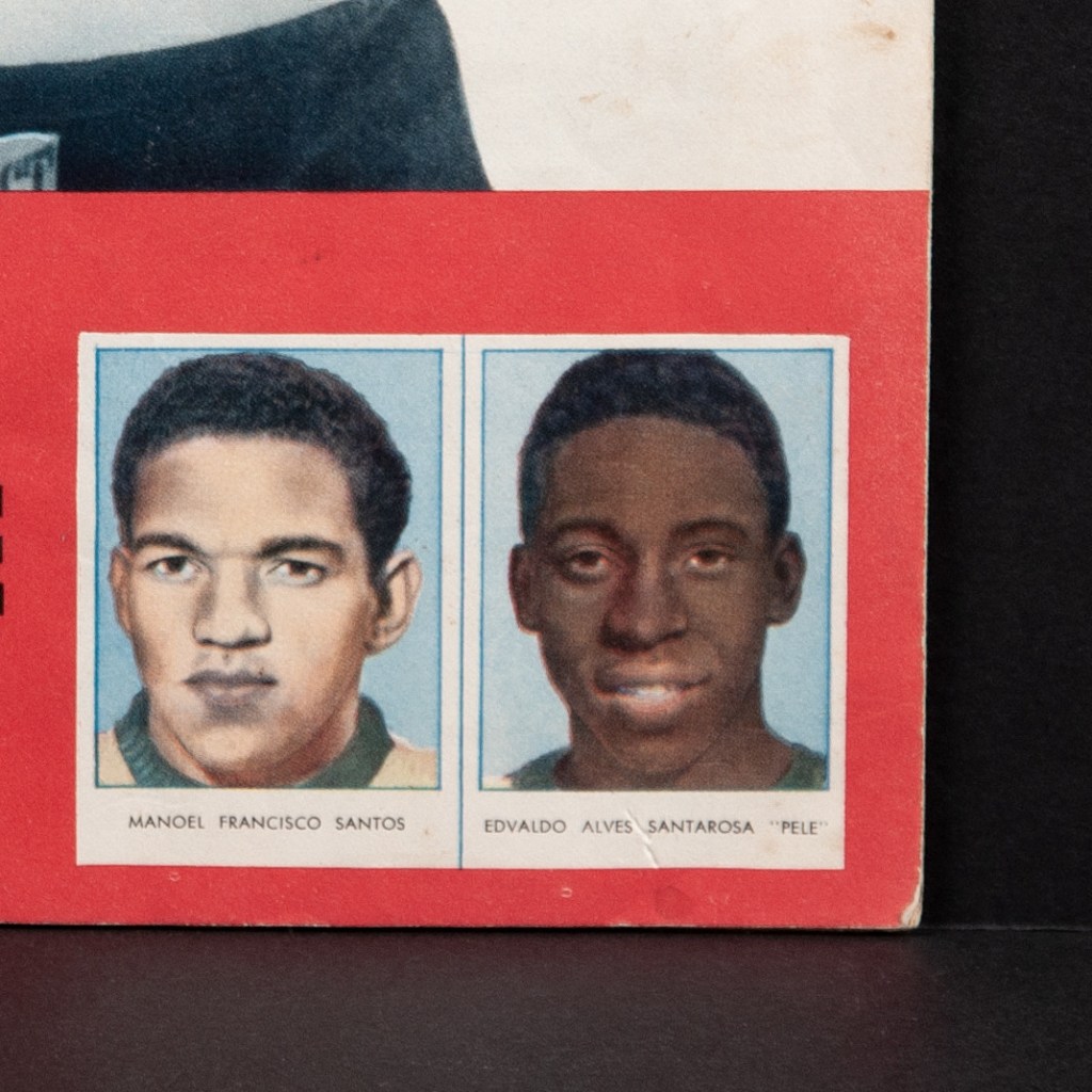 Alfabilder igen! Alfabilderna på sportstjärnor följde med de svenska tablettaskarna Alfa Bobbykola  och Alfa Pistill under 1950-talet. Bland dem finns en bild på Pelé som ska vara den första idol/sportbilden på honom. Han är blott 17 år gammal och har gjort dundersuccé under fotbolls-VM i Sverige. Nu är samlare över hela världen på jakt efter Alfabilden på Pelé. Sedan bara något år tillbaka klubbas de för hiskeliga summor. Här bilder det brasilianska landslaget från VM 1958, där det dyrbara rookiekortet på Pelé finns. Utrop 50 000 kronor, sålda för 266 000 kronor hos Crafoord auktioner i Lund i januari.