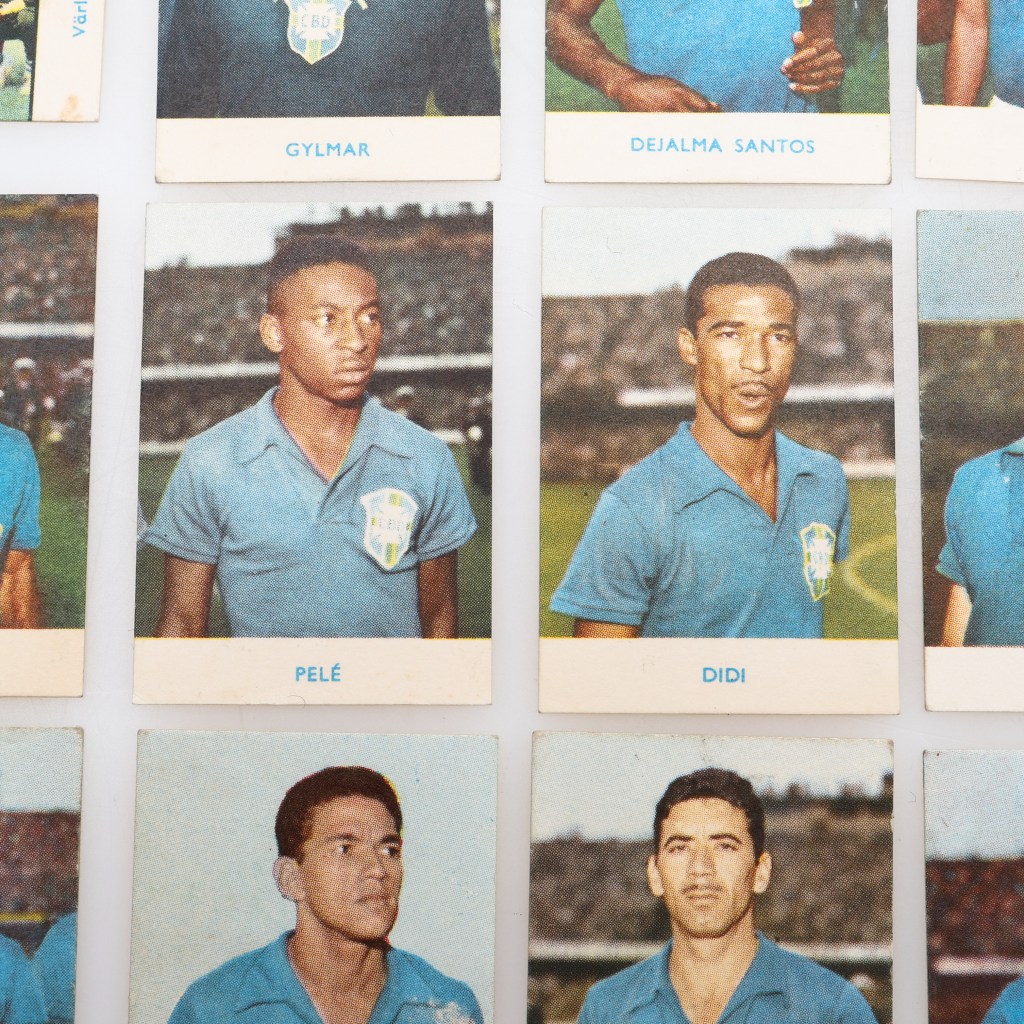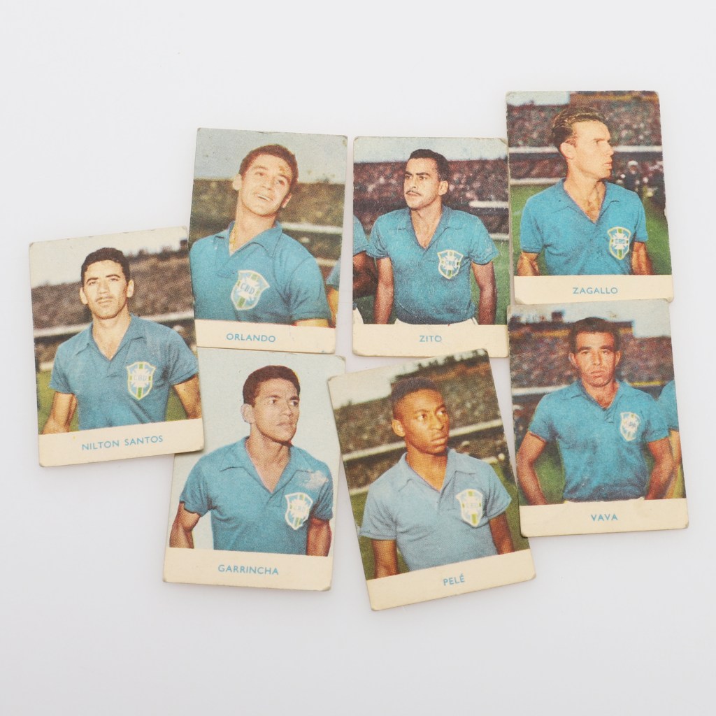 Alfabilder. Ett litet parti med Alfabilder på åtta brasilianska fotobollsspelare (inklusive Pelé) som medverkade vid fotbolls-VM i Sverige 1958: Garrincha, Vava, Nilton Santos, Zagallo, Orlando, Djalmar Santos, Zito samt Pelé. Bilderna mäter ca. 48 mm. x 33 mm och har en kort introduktionstext på baksidorna. Alfabilder var samlarbilder som följde med i tablettaskarna Alfa Bobbykola och Alfa pastill i Sverige. Konditionsrapport Zito med ett litet hörnveck. Garrincha med liten fläck på baksidan. Djalma Santos med litet hörnveck. Pelé med minimala hörnveck och lindriga bruksspår. Utrop 30 000 kronor, klubbade för 196 006 kronor hos Crafoord auktioner i Malmö i juli.