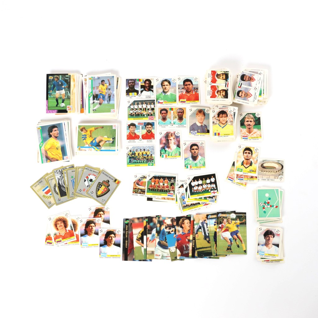 Klistermärken och samlarbilder 1990-tal. Cirka 500 stycken från fotbolls-VM 1990 och 1994. Bland annat Maradona och Valderama. Utrop 6 500 kronor hos auktionsverket Engelholm, sålda för 3 550 kronor för ett år sedan.