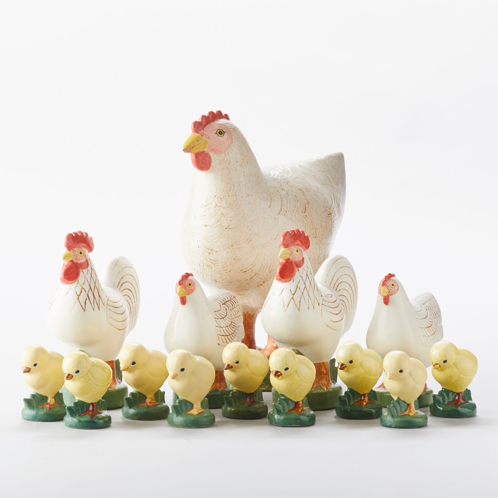 - Leghorn. Lisa Larson har gjort en hel del påskprylar. Såväl hönor, tuppar, kycklingar och äggkoppar. Här 14 figurer ur serien Leghorn som kom 1968, stengods, 8-30 cm höga. Utrop 3 000 – 4 000 kronor, klubbade för 7 000 kronor hos Uppsala auktionskammare.