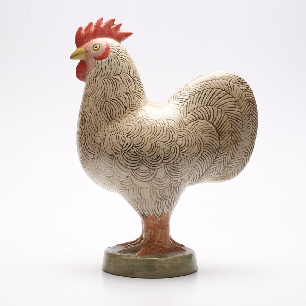2..Lisa Larson tupp. Ingår i serien leghorn som kom 1968, stengods, signerad Lisa L, K-studion, 38 cm hög. Utrop 2 500 kronor, såld för 3 600 kronor hos Gomér & Andersson.