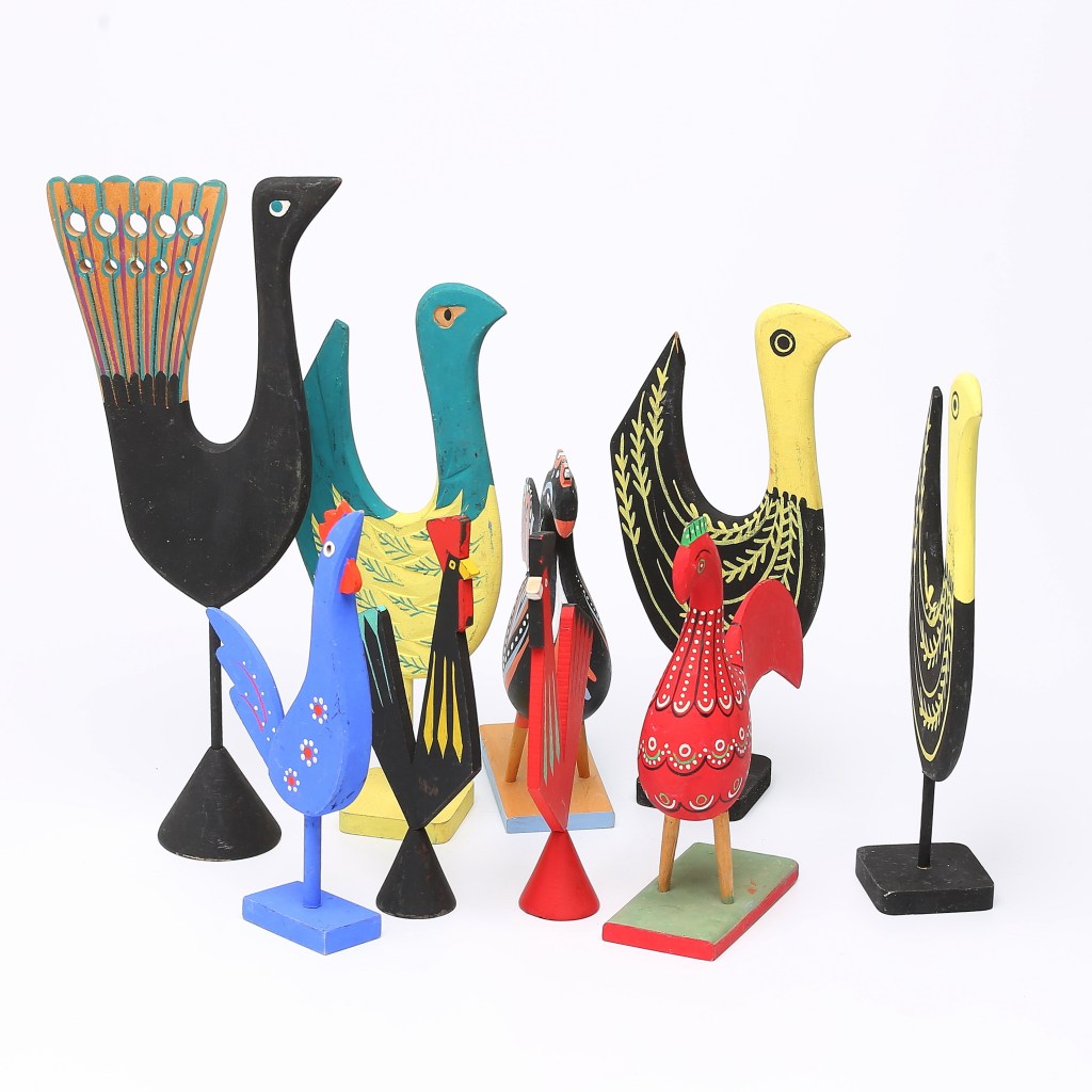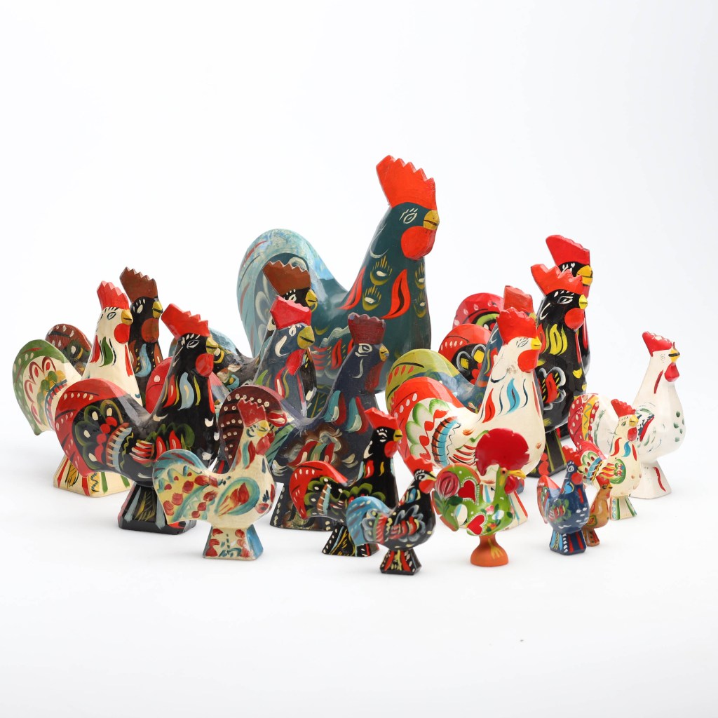6. Dalatuppar. Hela 18 stycken Dalatuppar i trä och en liten portugisisk tupp Barcelo i gips. Utrop 1 000 kronor, klubbade för 1 675 kronor hos Stockholm auktionsverk i Malmö.