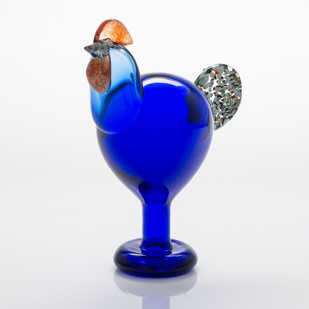 5. Oiva Toikka tupp. En riktigt häftig tupp är Oiva Toikkas glastupp. Till en början tillverkades de av Nuutajärvi Notsjö, numera hos Iittala. De går alltid dyrt på auktion. Här en signerad, från Notsjö, 30 cm hög. Utrop 4 000 kronor, klubbad för 9 837 kronor hos Auktionsmagasinet Vänersborg i februari.