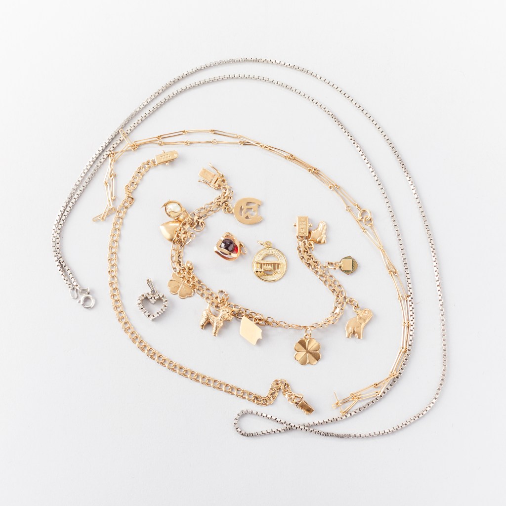 2. Parti guld. Armband, två stycken och halsband samt berlocker. Guld, 18K respektive 12K. Armband, L 18,5 – 19 cm. Halskedja, längd 53 cm. Hjärtformat hänge/berlock besatt med diamanter, totalt 0,24 ct enligt inskription. Vikt totalt c:a 25 gram. Utrop 6 000 – 8 000 kronor, sålt för 8 000 kronor hos Uppsala auktionskammare.