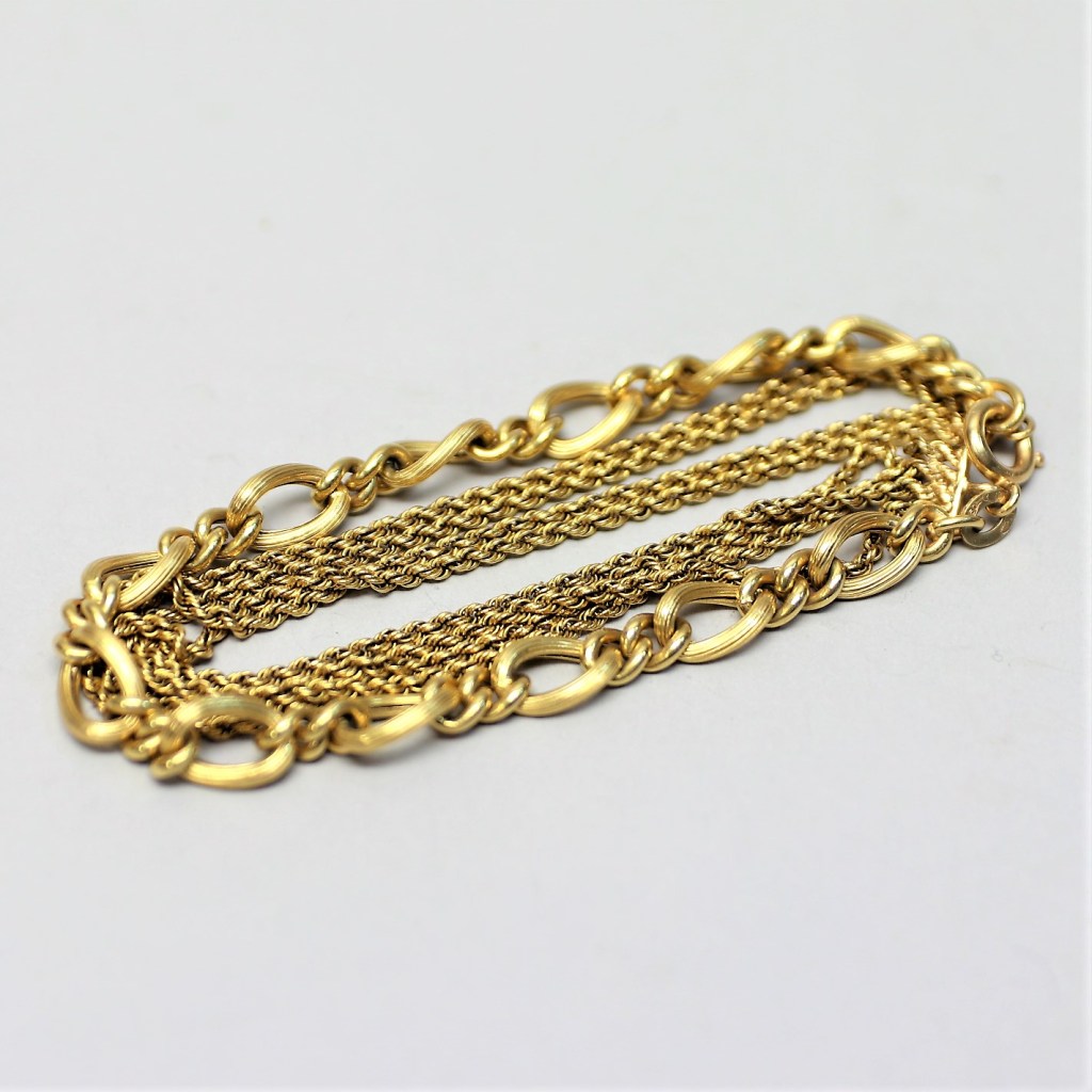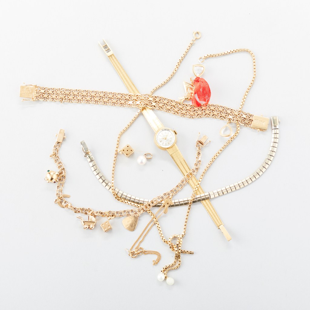 3. Parti med guldsmycken. Guld 18K. Fyra armband, ett halsband, ett damarmbandsur, fyra berlocker. Total vikt c:a 88 gram. Utrop 20 000 – 25 000 kronor, sålt för 27 000 kronor hos Uppsala auktionskammare.