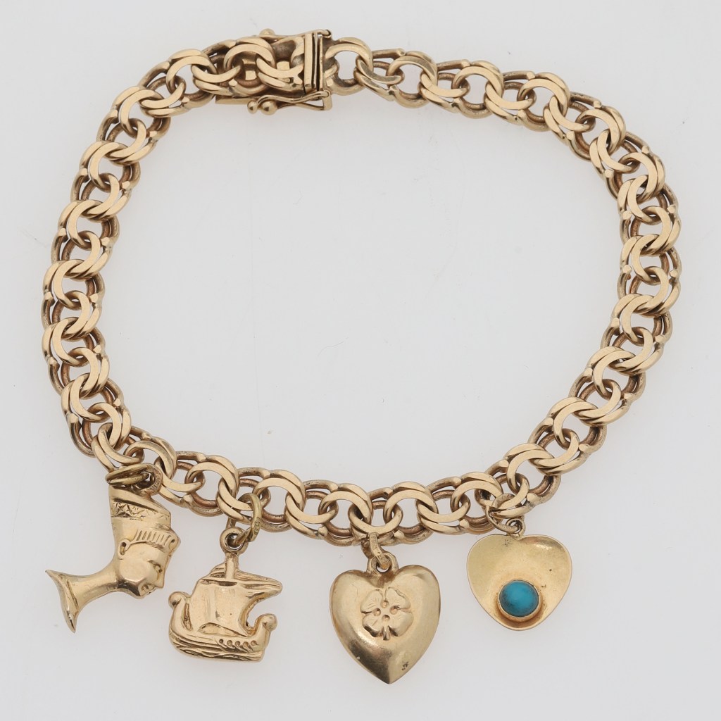 10. Berlockarmband. Bismarcklängd, 18k guld, fyra berlocker, längd 18,5 cm, vikt 18,3 gram. Utrop 8 500 kronor, klubbat pris 7 480 kronor hos Ekenbergs.