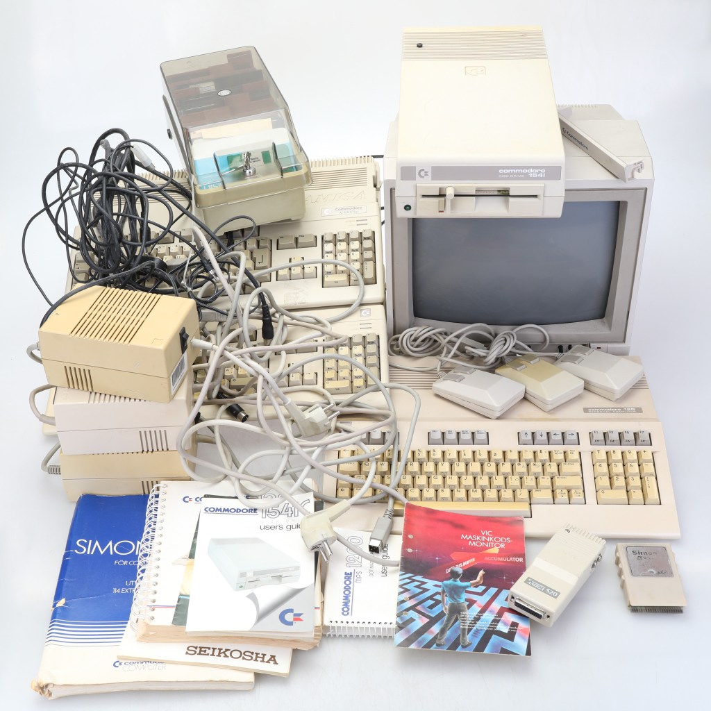- Datorer, Commodore. Flera datorer samt tillbehör. Personal Computer. Amiga 520. Disk Drive. Monitor/Skärm. Datormusar. Låda med disketter. Sladdar. Diverse instruktionsböcker. Utrop 1 200 kronor, sålt för 4 840 kronor i höstas hos Södermanlands auktionsverk.
