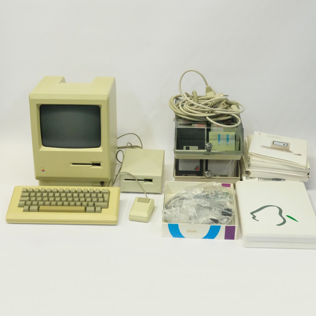 2. Macintosh. Dator modell M0001 P med tillbehör. Medföljande tangentbord, mus, manualer och diverse disketter, samt extern diskettläsare. Svensk och engelsk text. Tangentbord med europeiska/svenska tangenter. Utrop 500 kronor, sålt för 6 700 kronor i januari hos Björnssons auktionskammare.