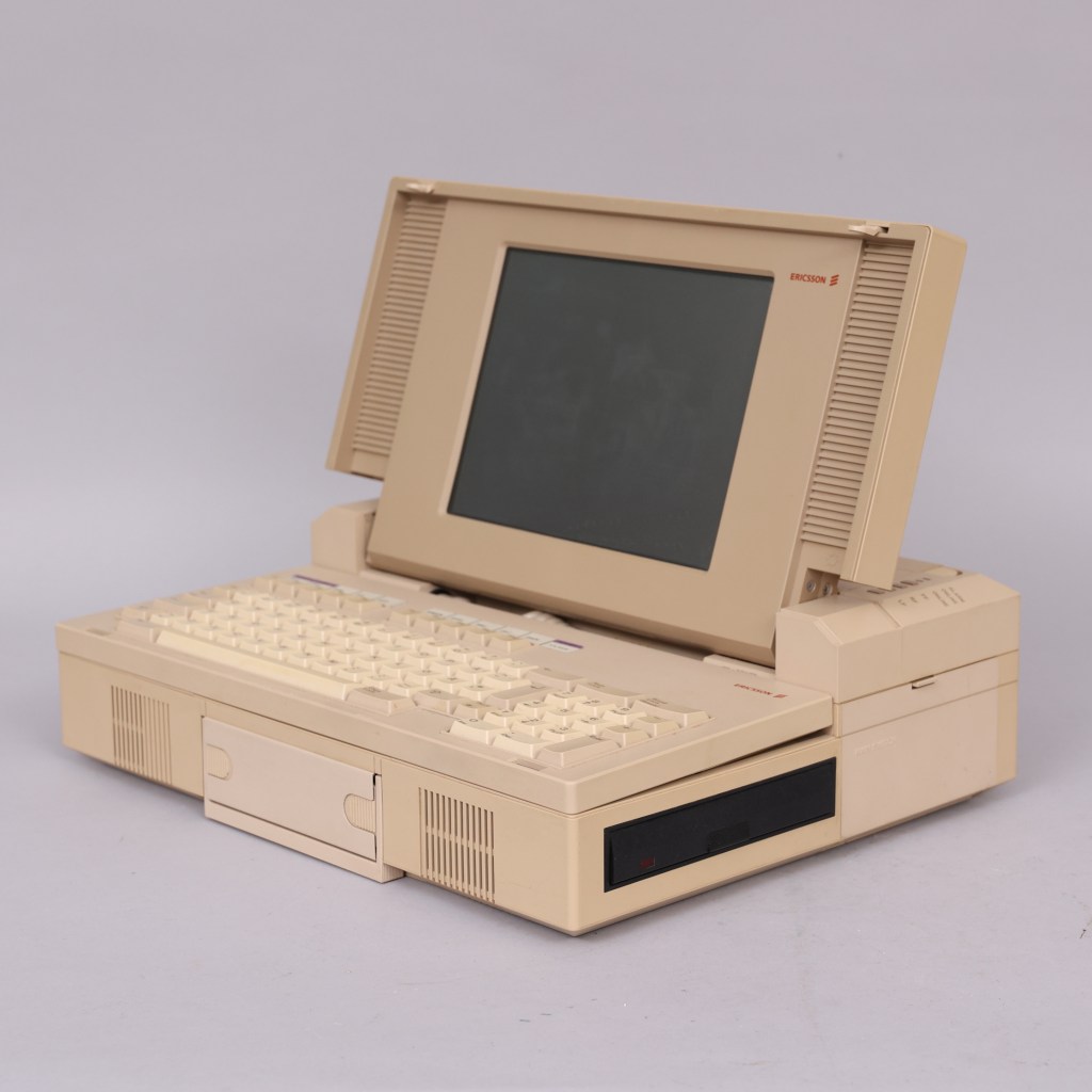 6. Ericsson Portable PC, 1980-tal. Ericsson Portable PC, tillverkningsstart 1985. Populärt under namnet adventskalendern på grund av det stora antalet luckor och skyddslock. Intel 8088-processor med 512 kB internminne. Inbyggd 5 1/2 tums diskettsation samt skrivare. Med tillhörande instrumentväska. Utrop 2 000 kronor, såld för 1 341 kronor för ett år sedan hos Garpenhus auktioner.