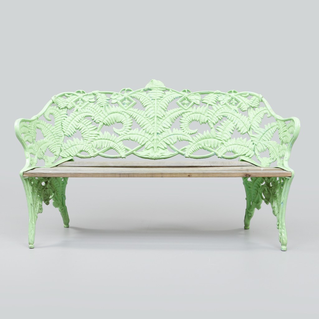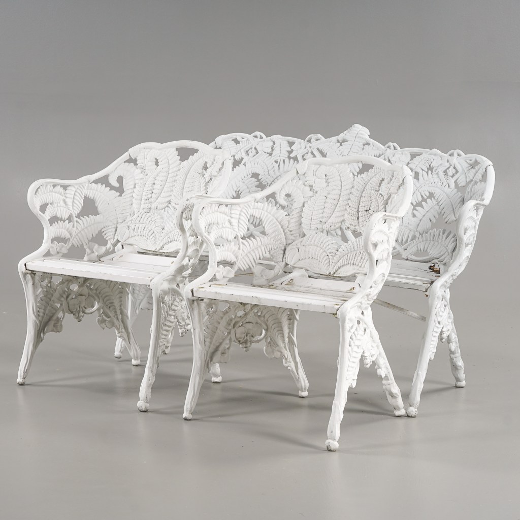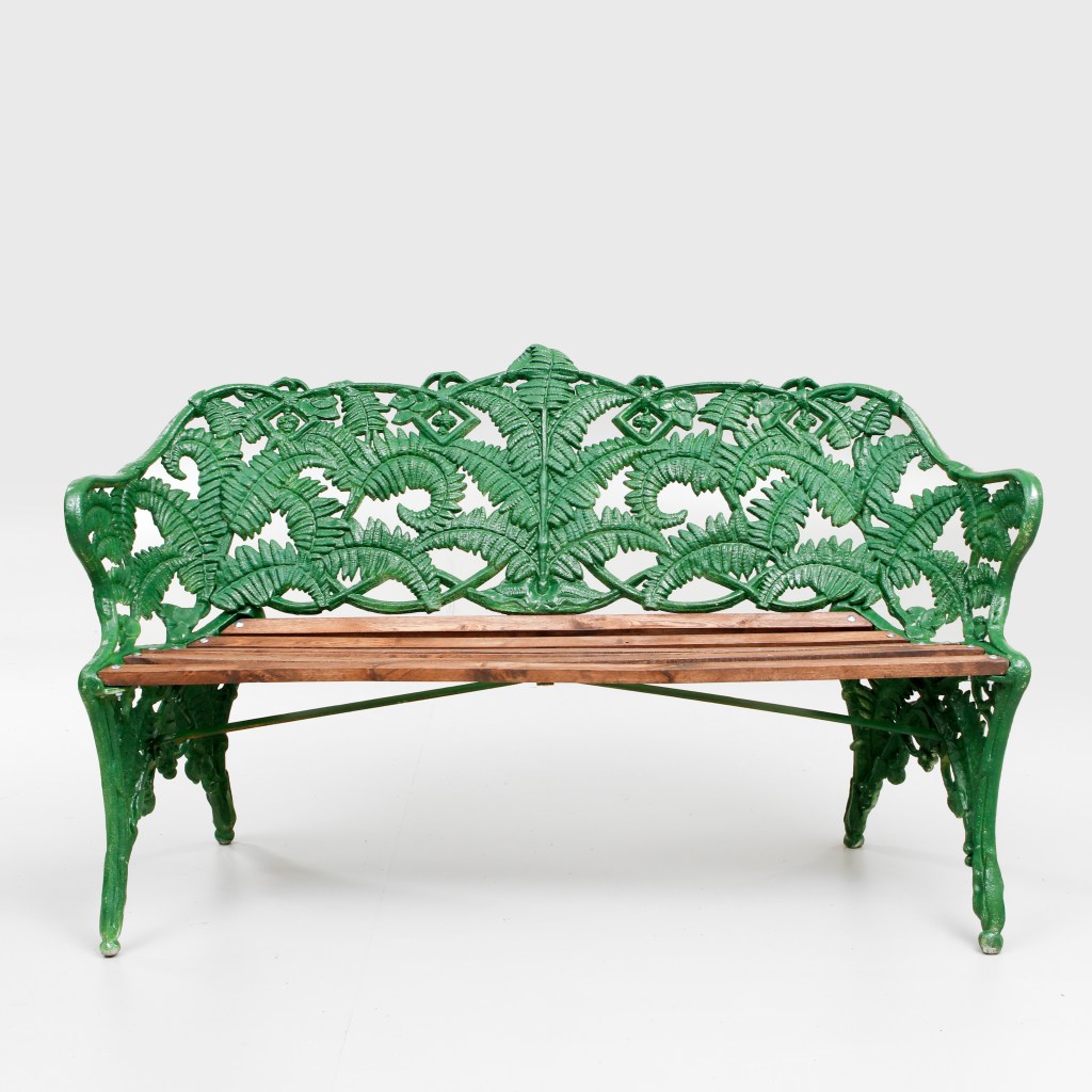Ormbunkssoffan .År 1851 hölls den första världsutställningen i London, där presenterades trädgårdsmöbler i gjutjärn från Coalbrooksdale. Ormbunkssoffan var en av nyheterna. Blev snabbt en populär parksoffa i Sverige. Den har tillverkats hos olika lokala gjuterier genom hela 1900-talet. Här en från Mönsterås Metallfabrik. Utrop 3 000 kronor, såld för 5 000 kronor hos Göteborgs auktionsverk.