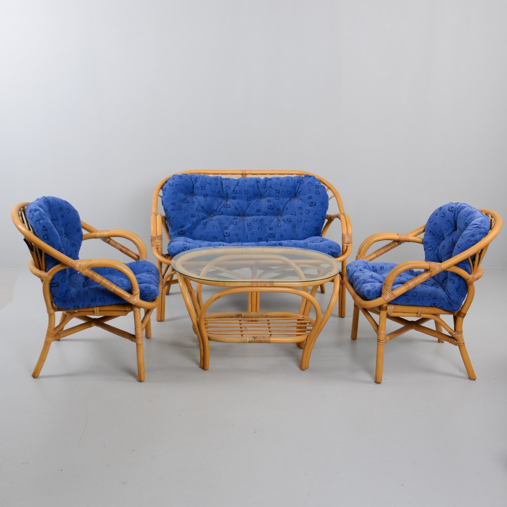 Ormbunkssoffa & fåtöljer . Från Melins i Anderstorp, 1900-talets andra hälft. Slitage. Utrop 8 000 kronor, klubbade för 9 500 kronor hos Karlstad Hammarö auktionsverk.