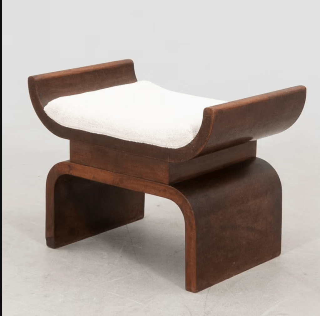 2. Art Deco. Mörkbetsat trä, fast stoppad tygklädd sits. 1900-talets första hälft. Utrop 2 500 kronor, såld för 8 010 kronor hos Bukowskis.