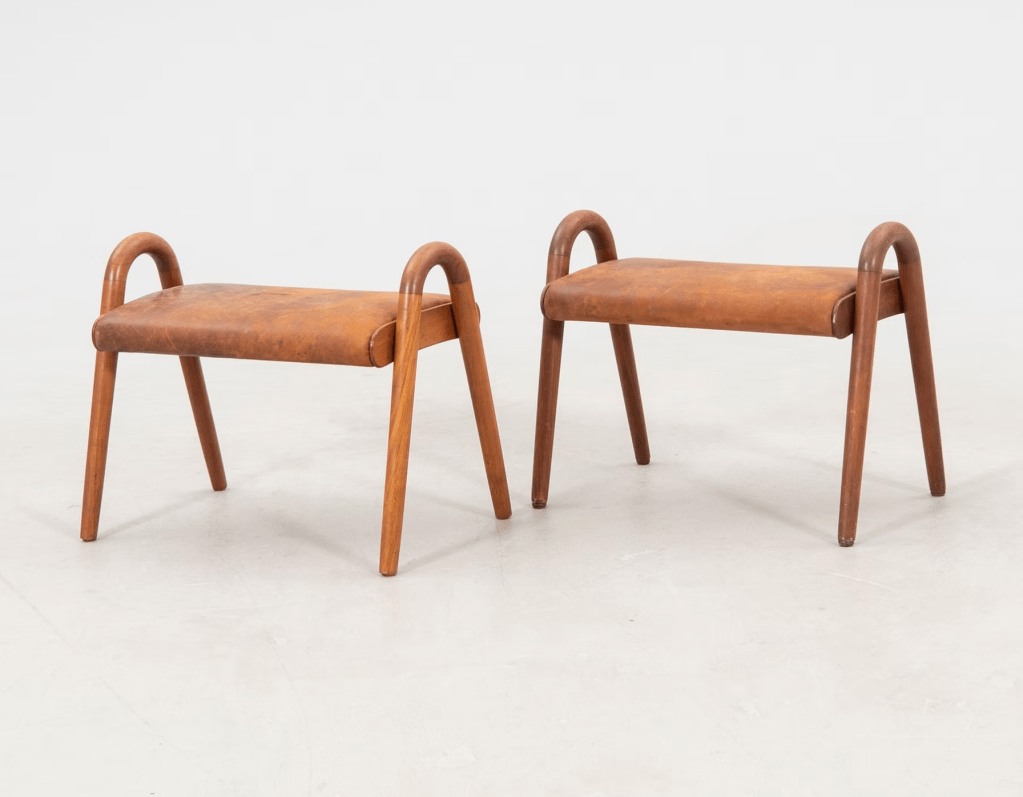 4. 1950-tal. Vilhelm Lauritzen pallar för Fritz Hansen Danmark, 1950-tal. Teak med skinnsits. Utrop 15 000 kronor hos Bukowskis, klubbade för 13 100 kronor.