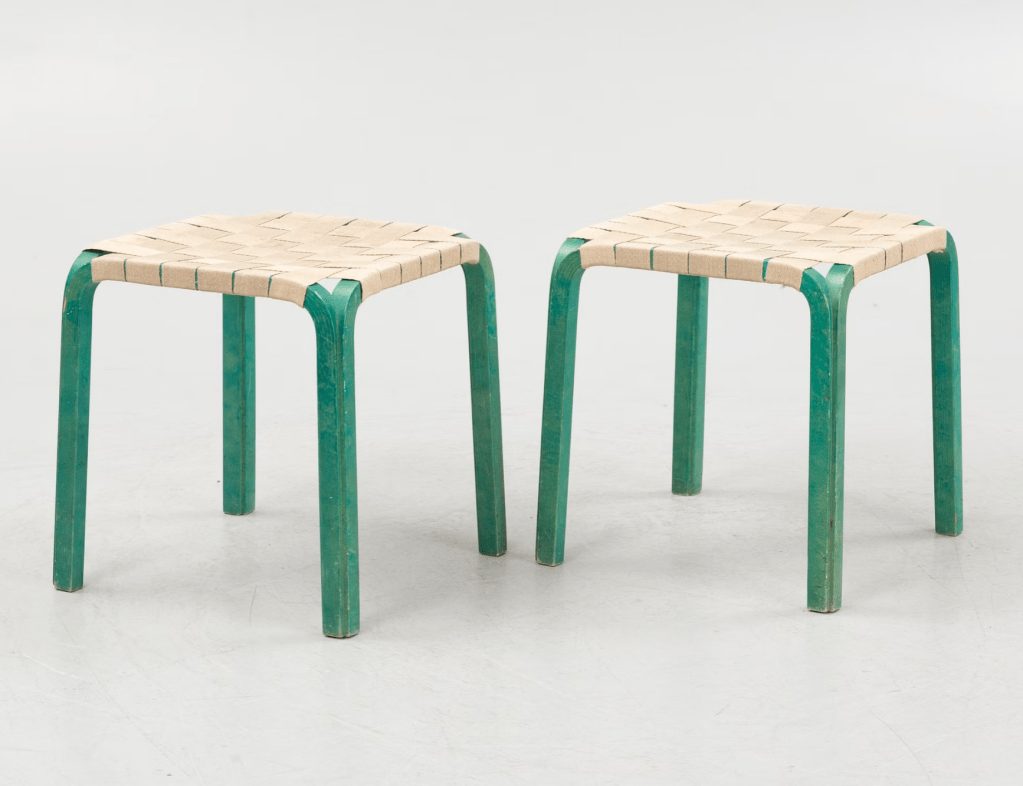 6. Y61. Pallar av Alvar Aalto, modell Y61. Grönbetsade, sadelgjord. Utrop 2 500 kronor, sålda för 4 300 kronor hos Bukowskis.