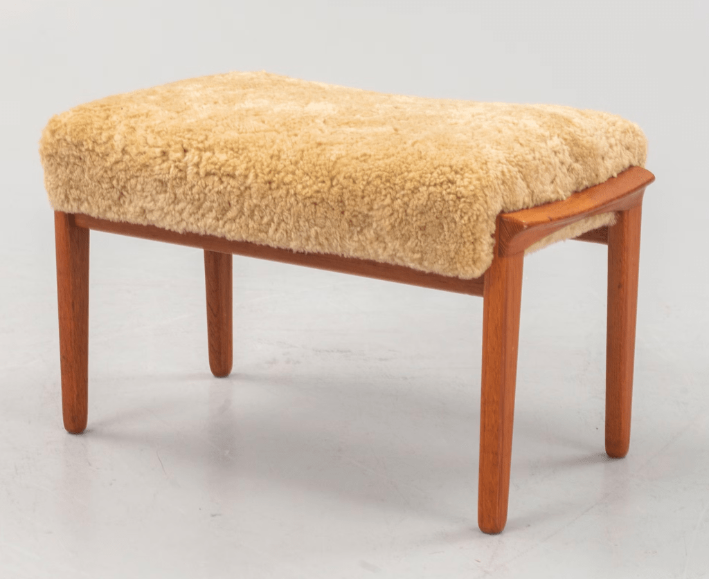 8. 1900-talets mitt. Omklädda pallar i fårskinn är populära. Här en i teak från 1900-talets mitt. Utrop 4 000 kronor hos Bukowskis, såld för 7 900 kronor.