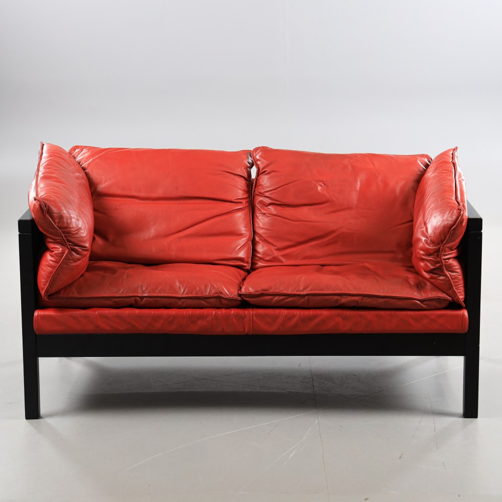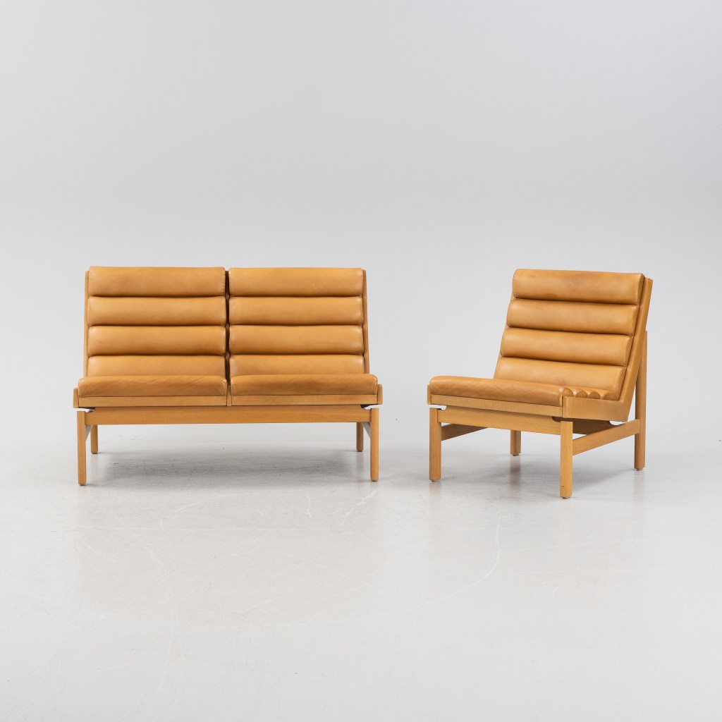 4. 1960-tal. Av Karl-Erik Ekselius, soffa och fåtölj, för JOC Möbler, Vetlanda, 1969. Stomme av ek. Stoppad sits och rygg med klädsel av ljust läder. Stämpelmärkt. Utrop 5 000 kronor, sålt för 16 500 kronor hos Bukowskis.